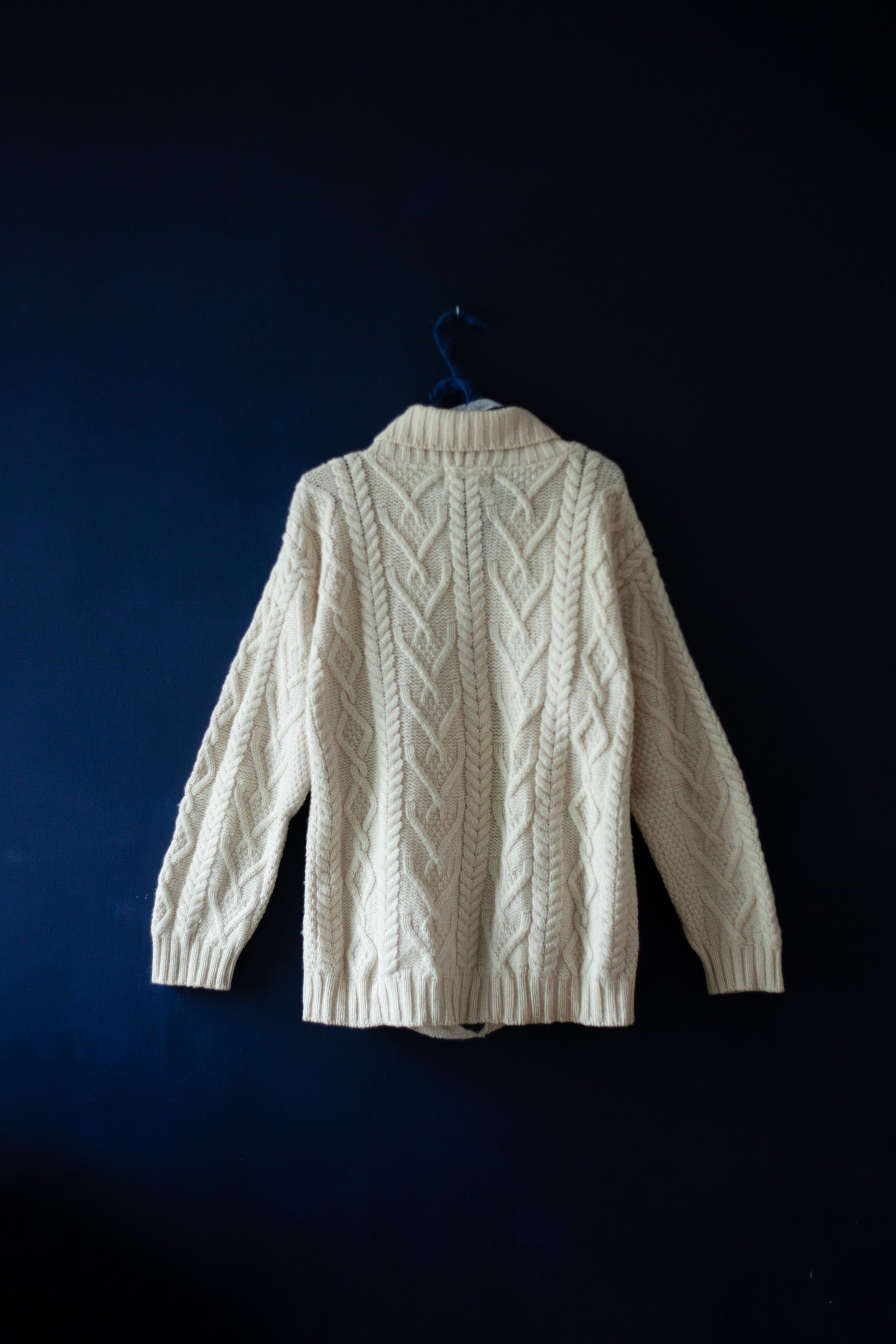 Cardigan 100% pure laine mérinos tricoté en Irlande. Écru. Col camionneur. Taille L homme.