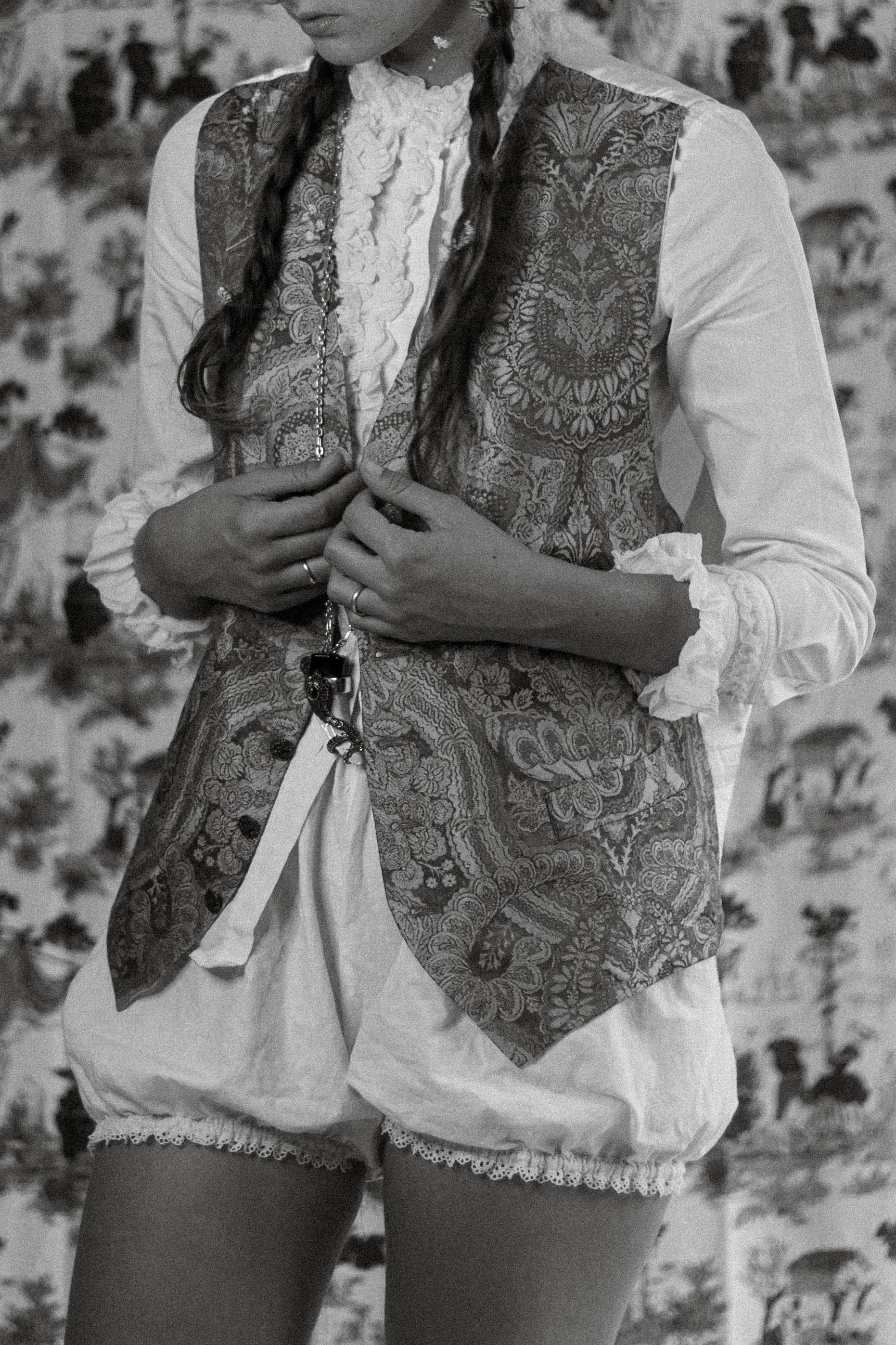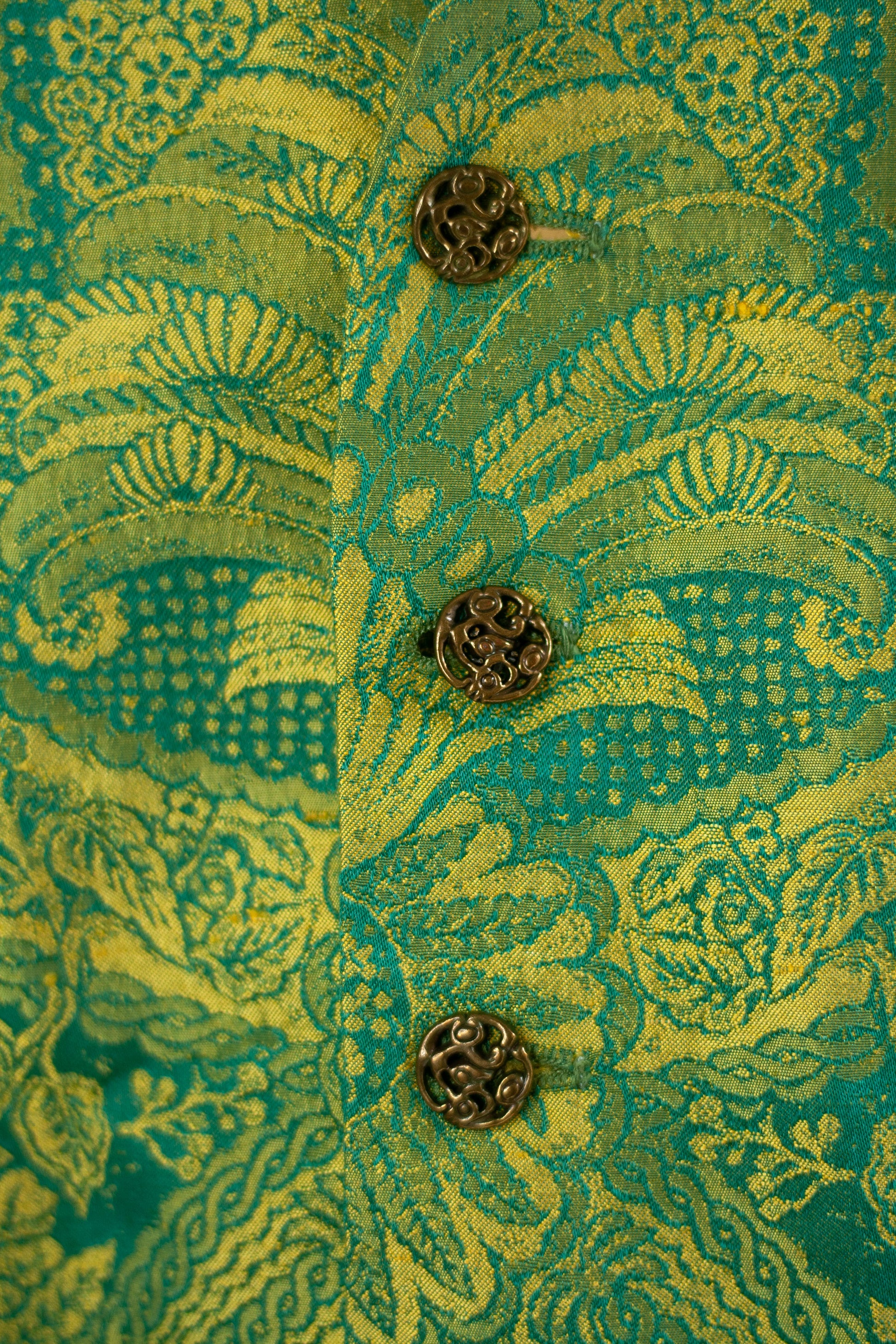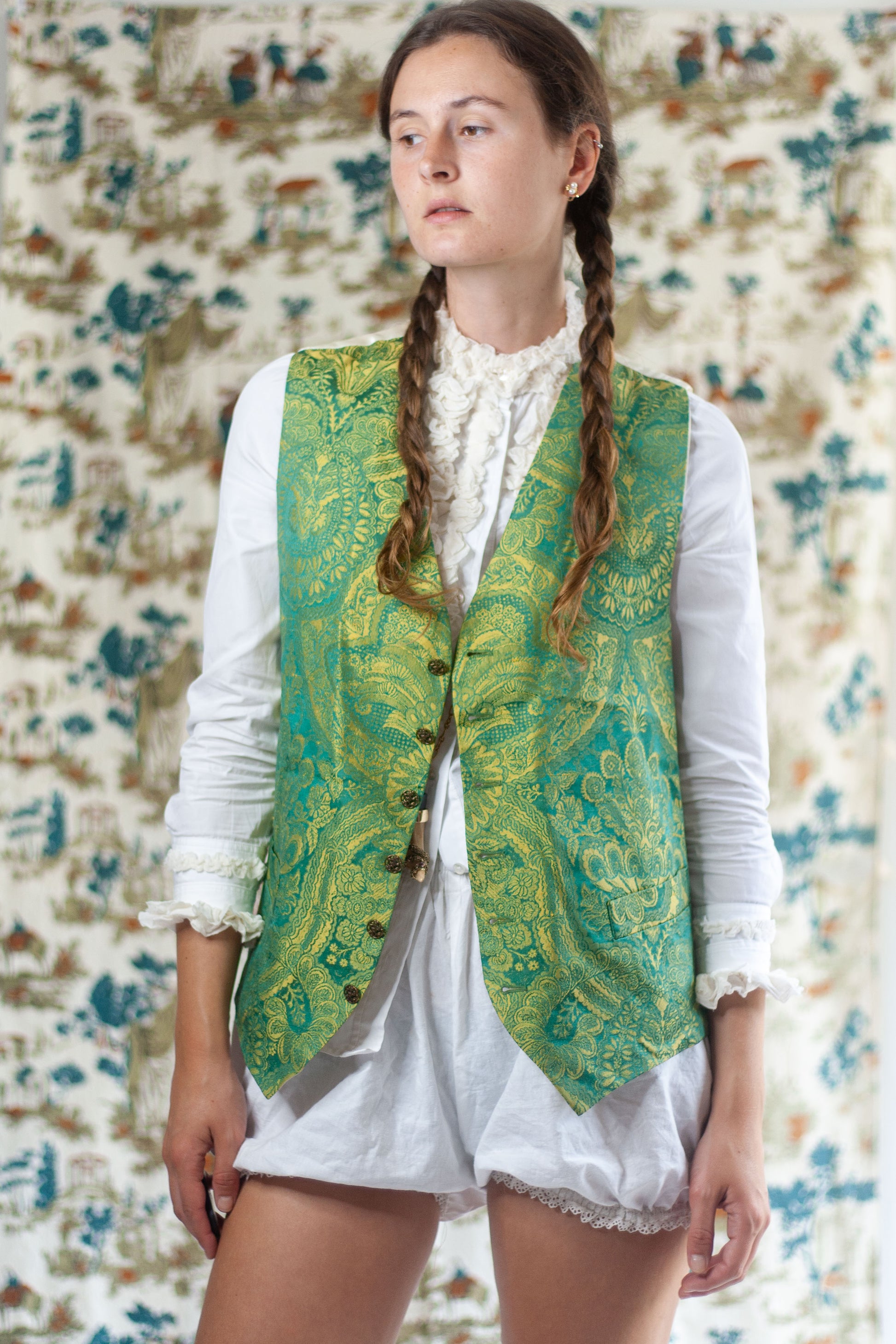 Gilet 100% soie vert Favourbrook. Sublime imprimé cachemire. Made in England. Patte de boutonnage simple, deux poches plaquées. Parfait état. Taille 38 à 44. Peut aussi se porter oversized. Modèle mixte.
