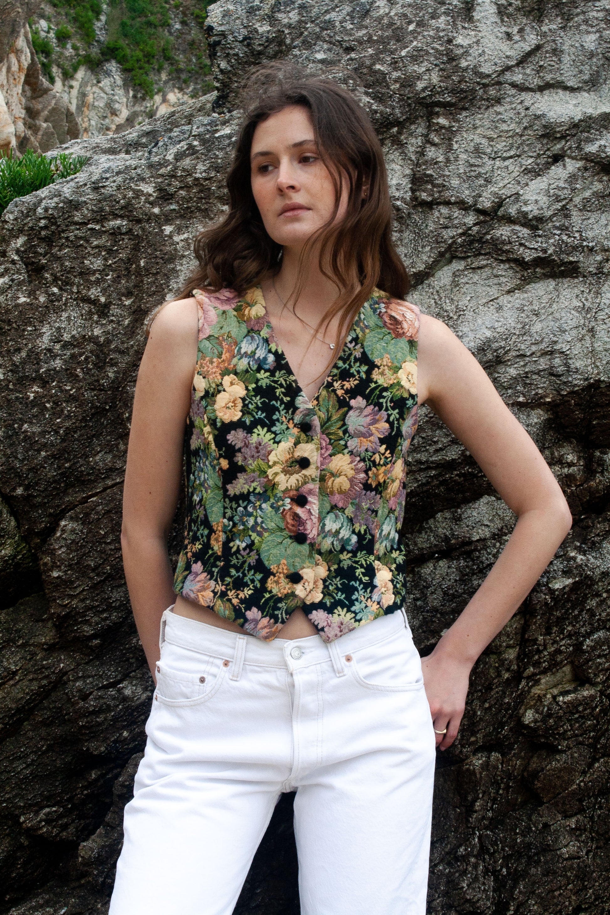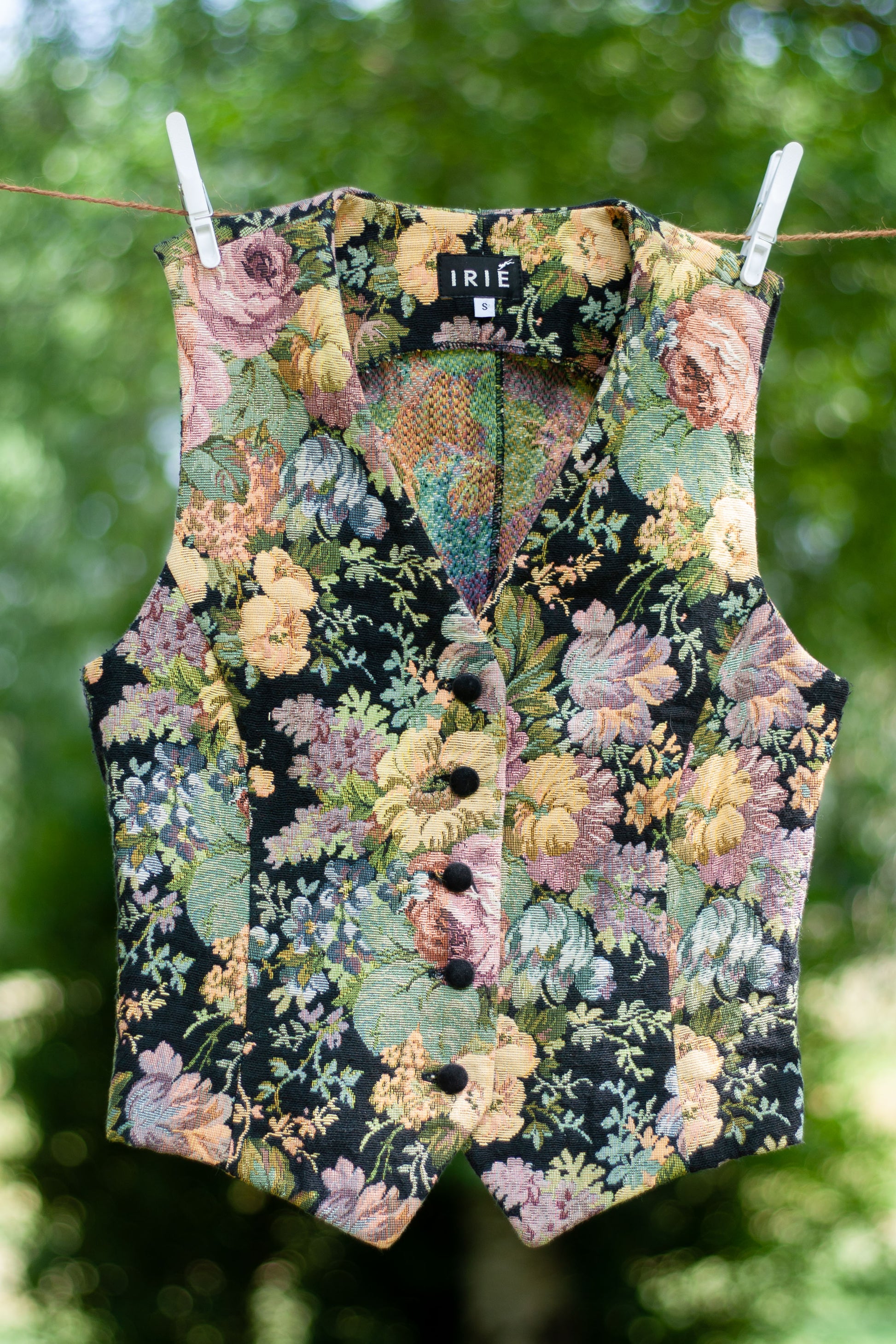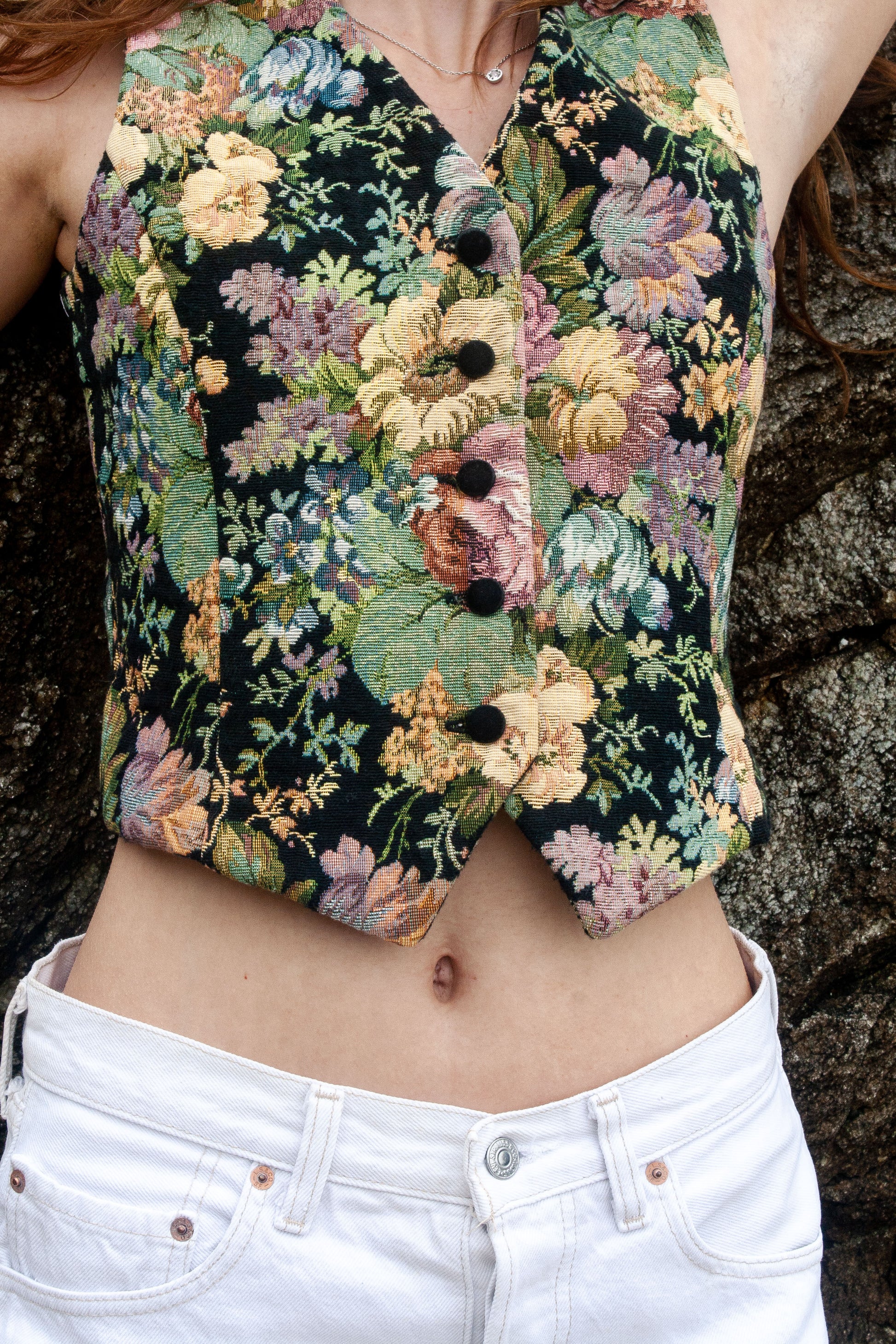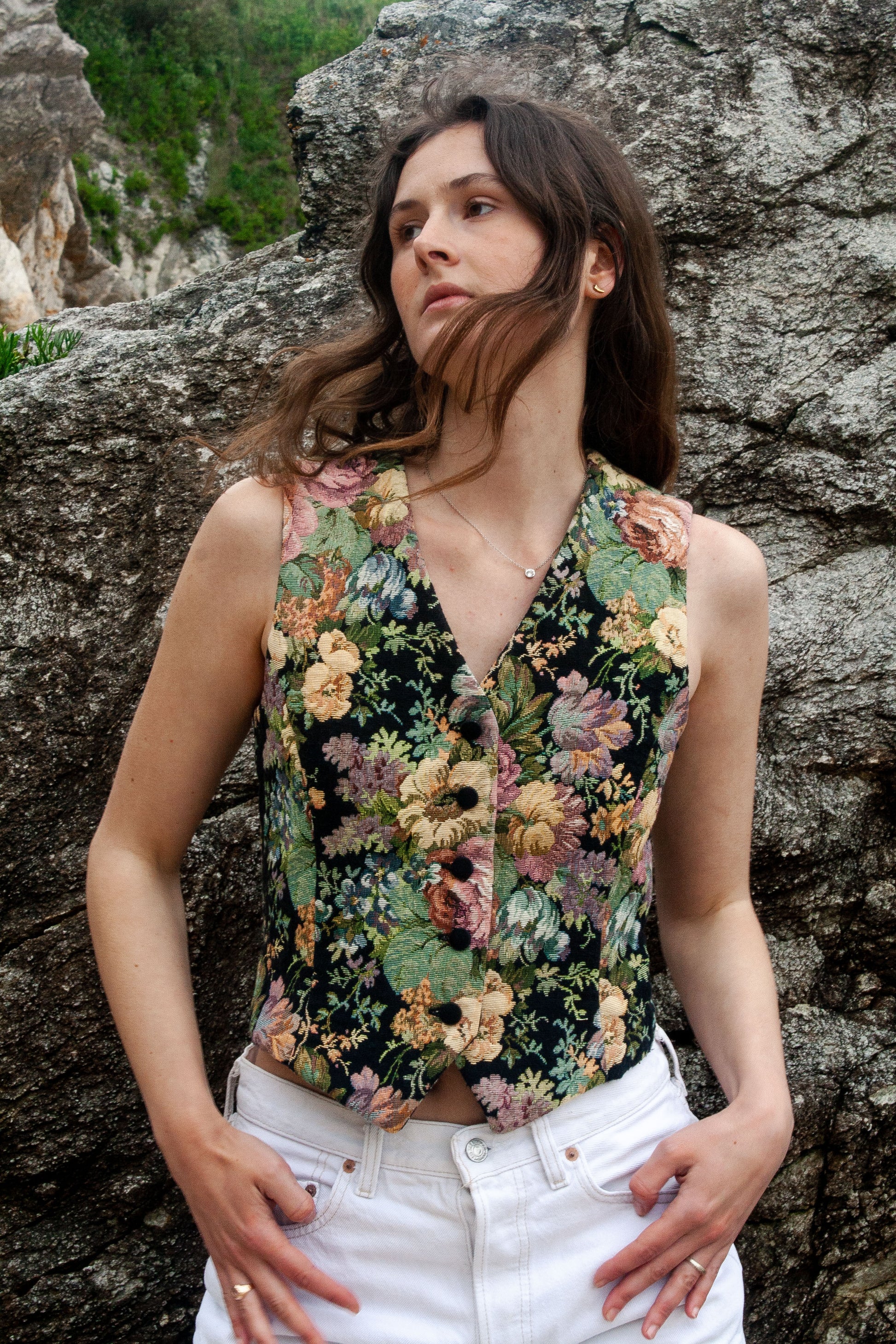Gilet sans manches à fleurs Irié vintage. Taille S. Boutons recouverts de velours noir. Découpe princesse. Taille S.