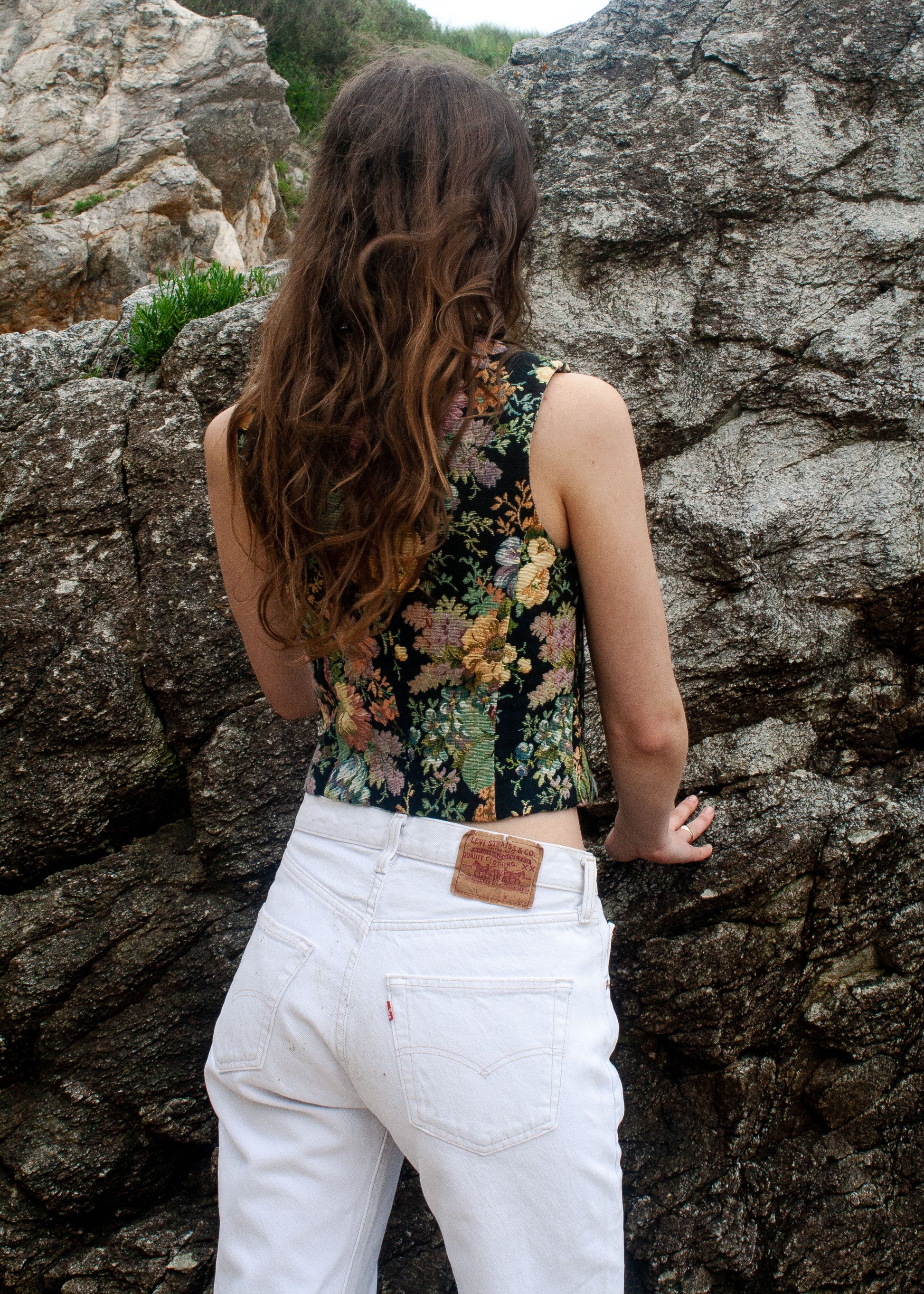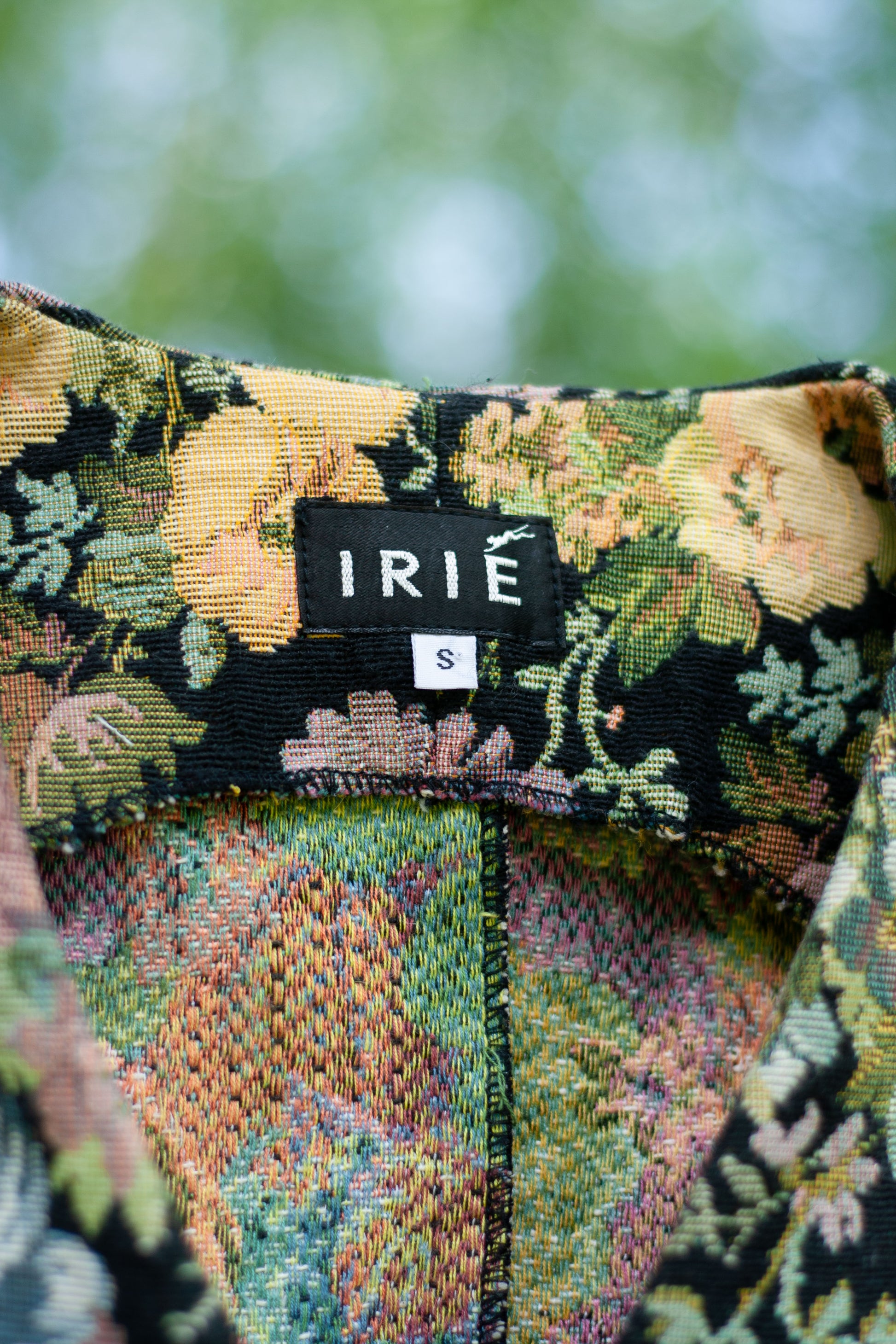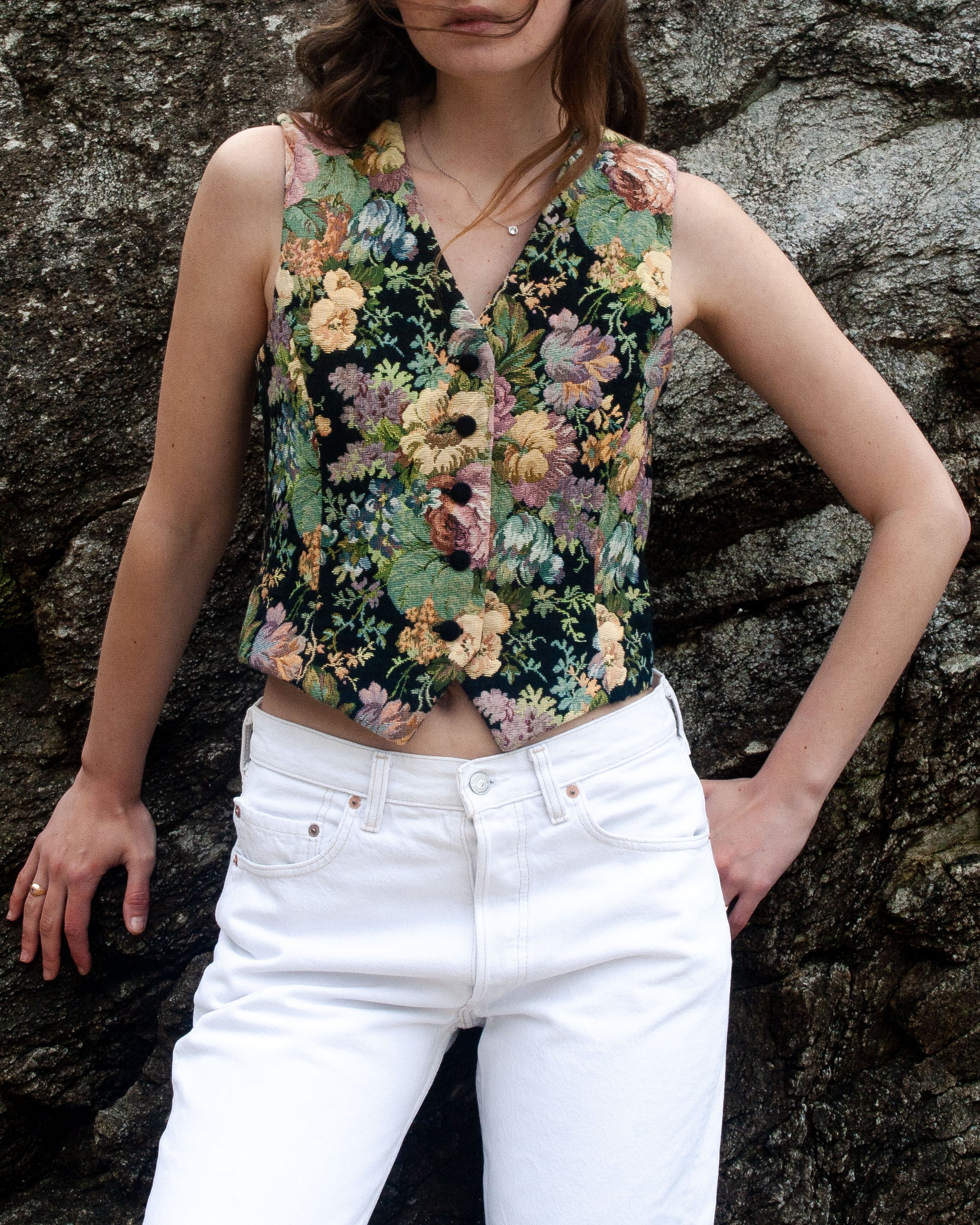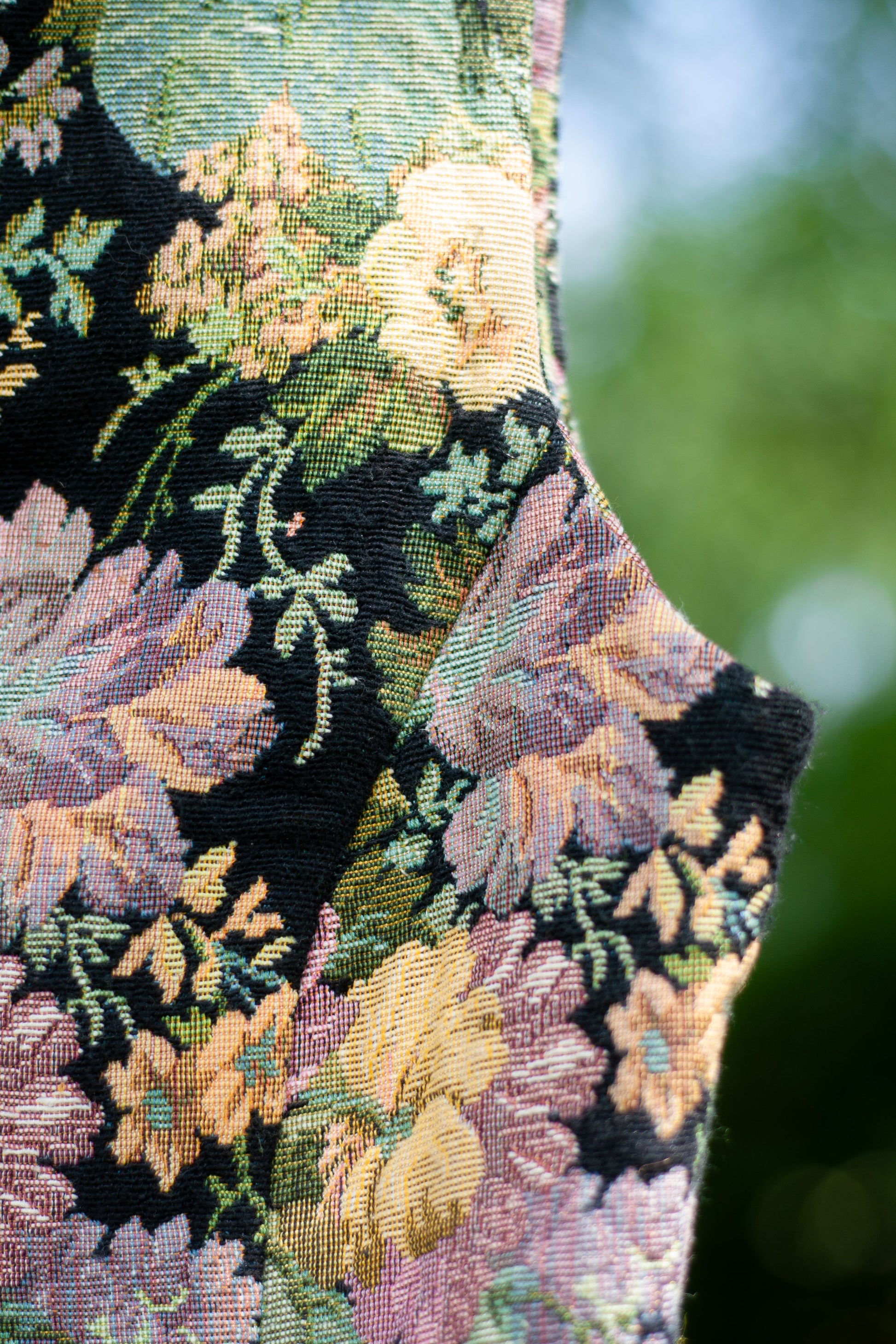 Gilet sans manches à fleurs Irié vintage. Taille S. Boutons recouverts de velours noir. Découpe princesse. Taille S.