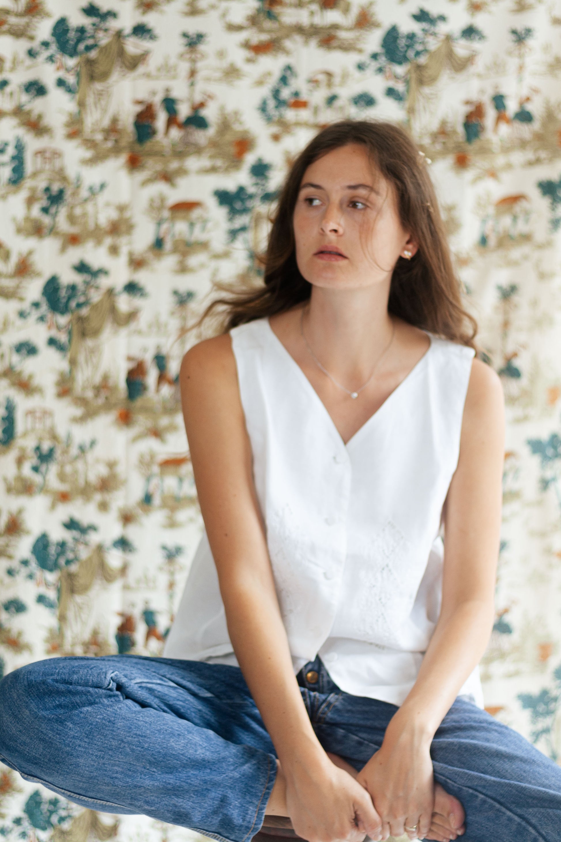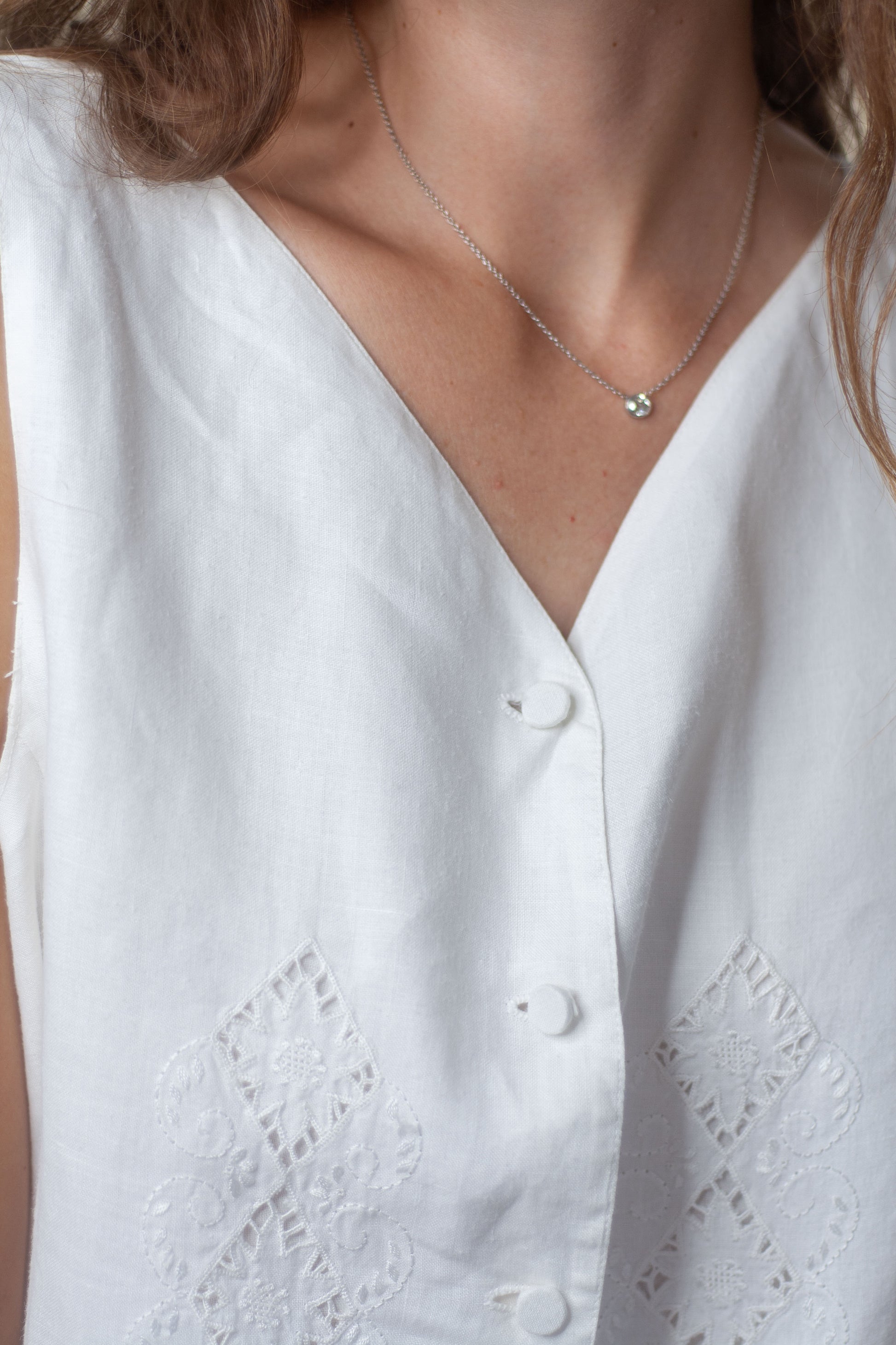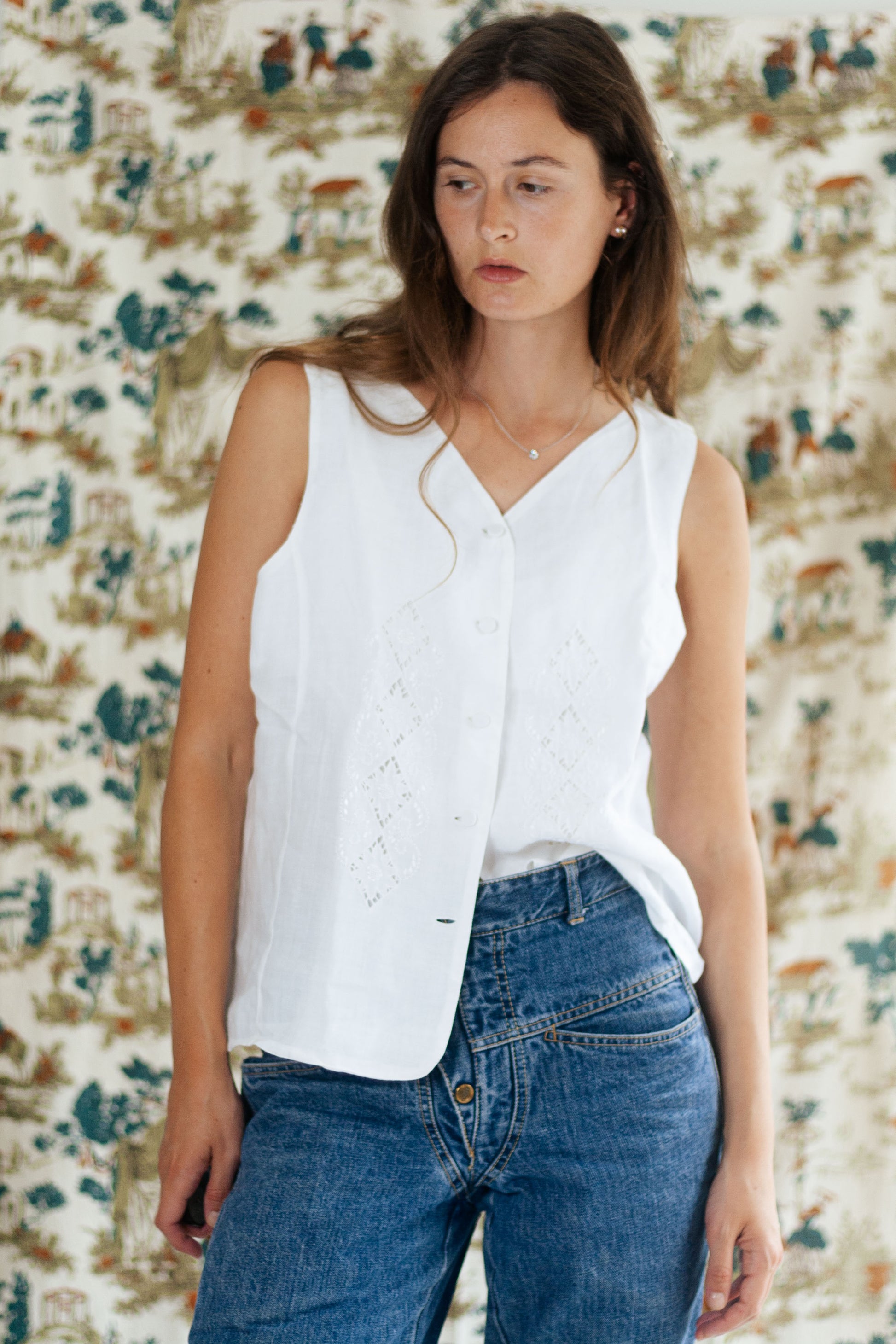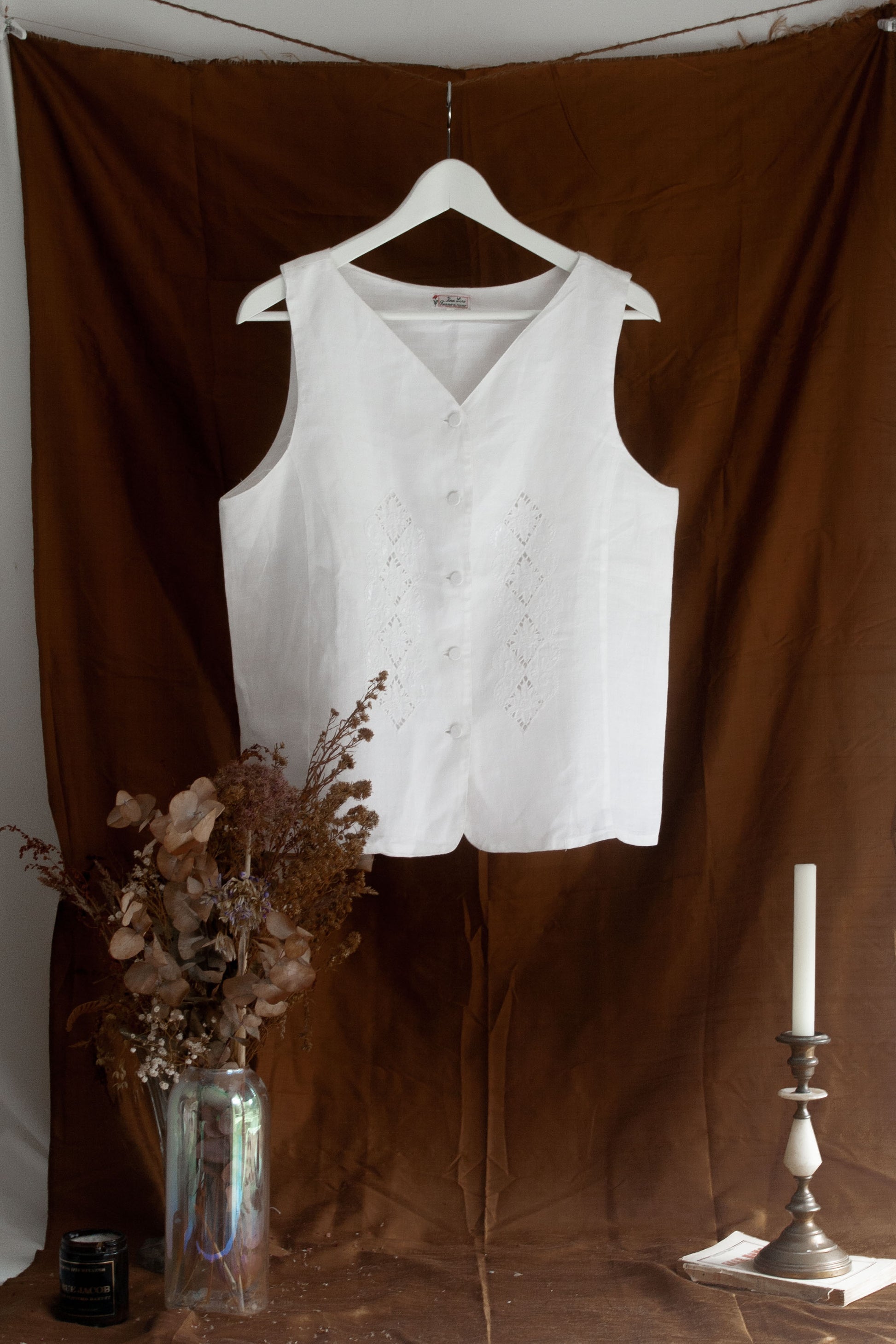 Chemisier sans manches fabriqué en Italie. Superbes broderies réalisées à la main. Boutons recouverts. 100 % lin. Taille 42-44. Peut aussi se porter oversized.
