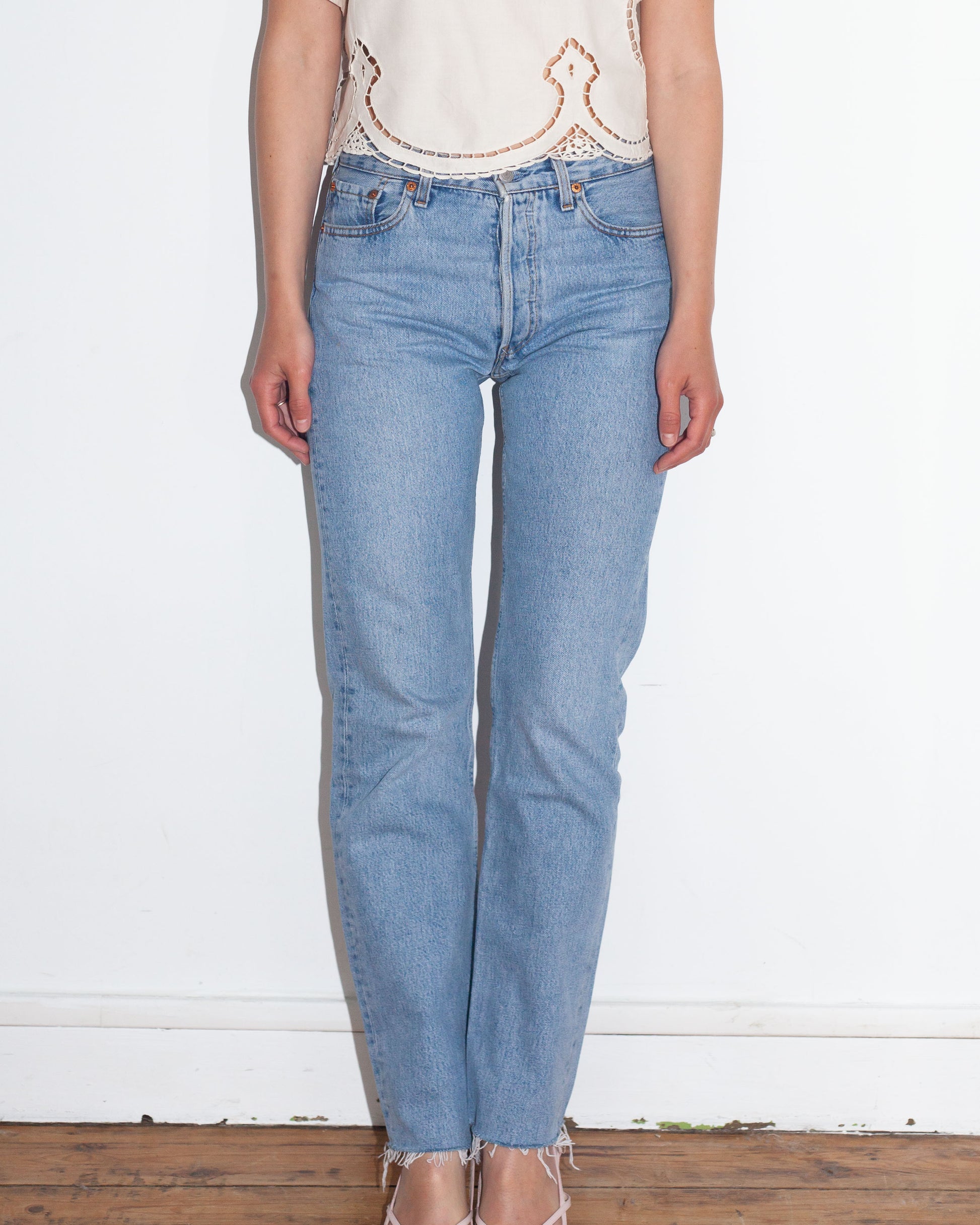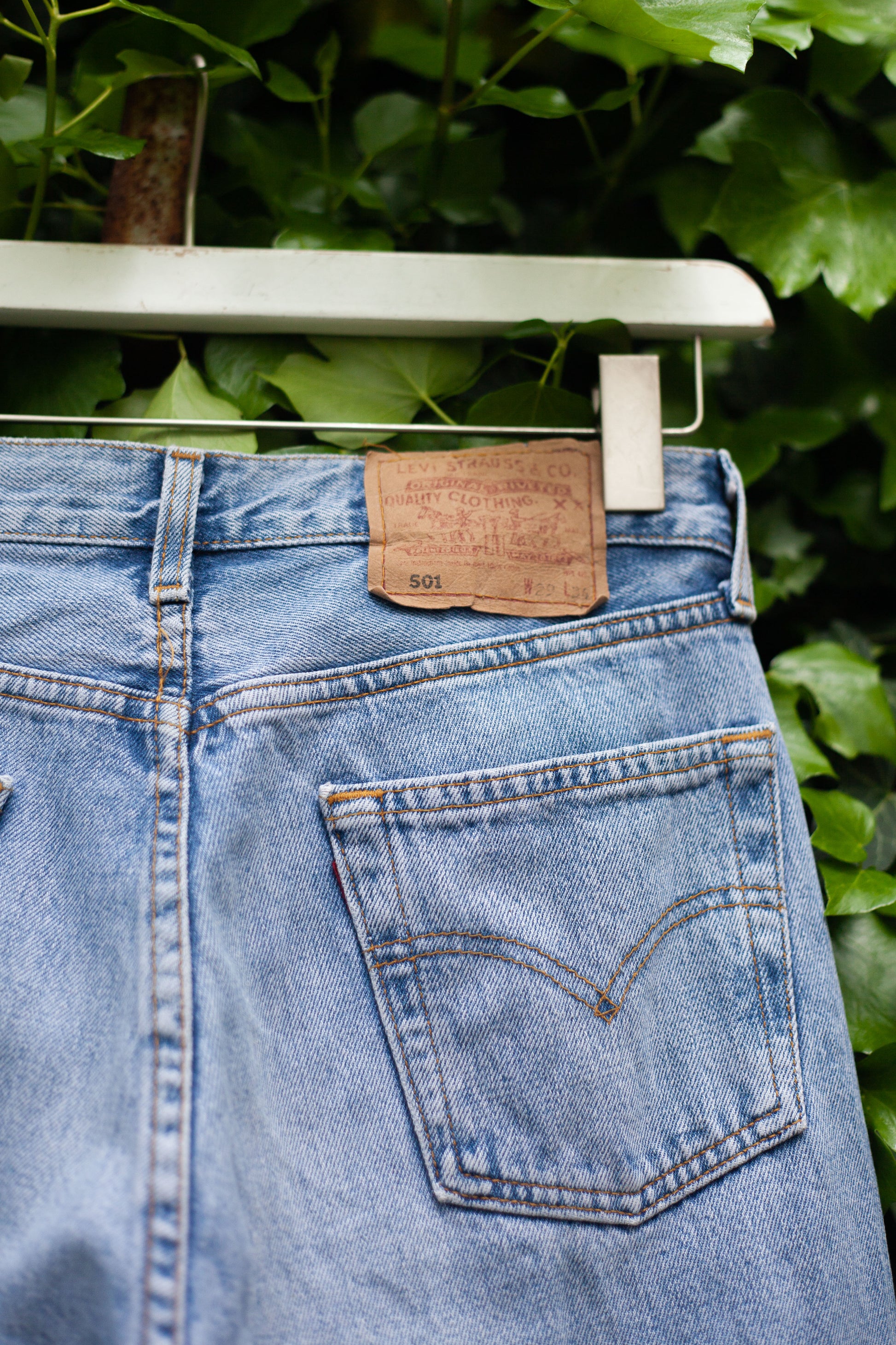 Sublime jean Levi's bleu clair. Fabriqué en France (code d'usine 275) en 1996. Denim 100% coton. Modèle iconique 501 : fermeture boutonnée, coupe droite. W29 L34 : correspond à une taille w27 actuelle (bon 36, petit 38). La jambe a été coupée et effilée au niveau de l'os de la cheville (vous pourrez le recouper si le jean est trop long, il suffit d'une règle et d'une bonne paire de ciseaux). Très bon état général. À noter, la languette "Levi's" rouge qui se trouve sur la poche arrière a été coupée.