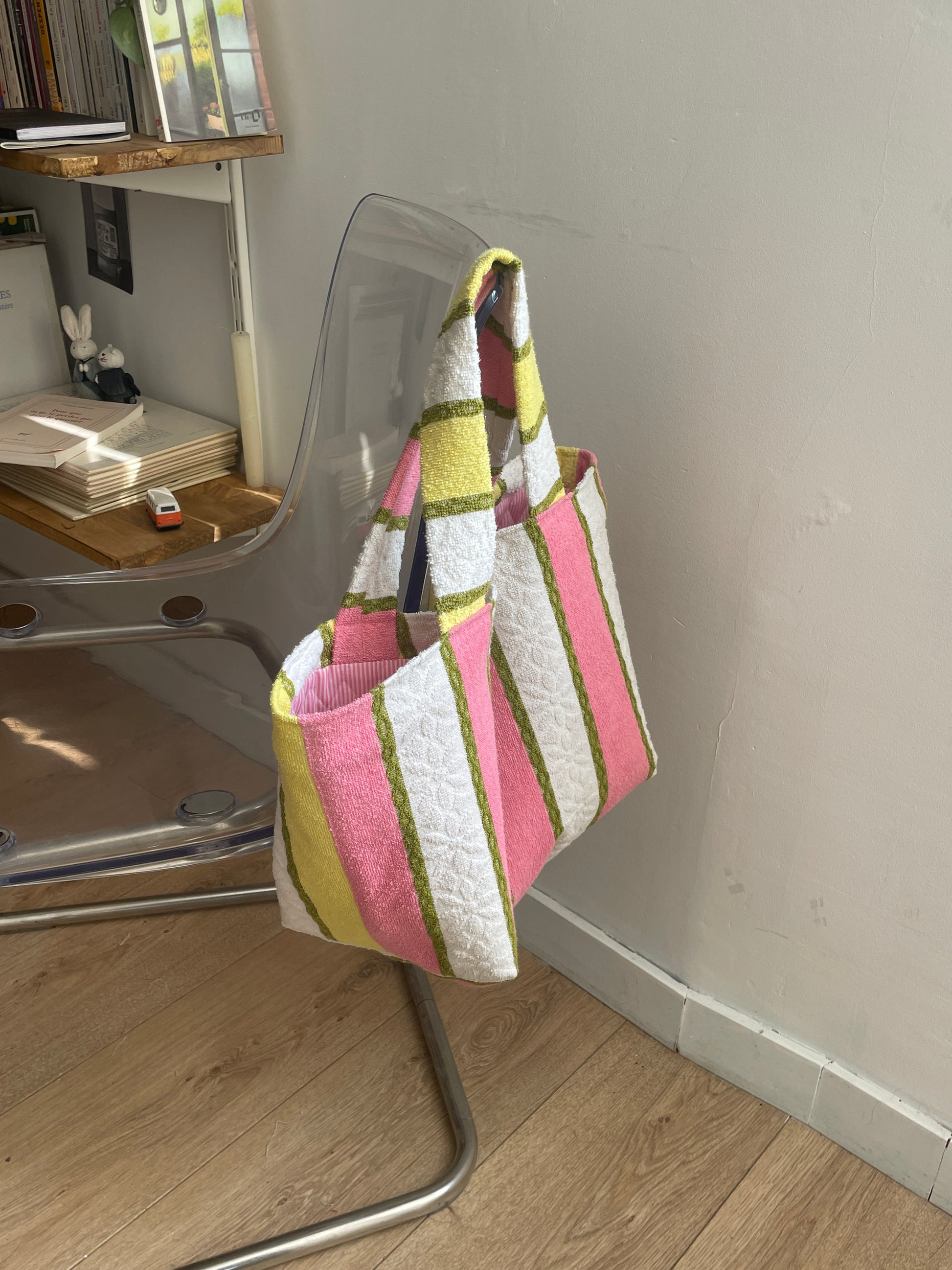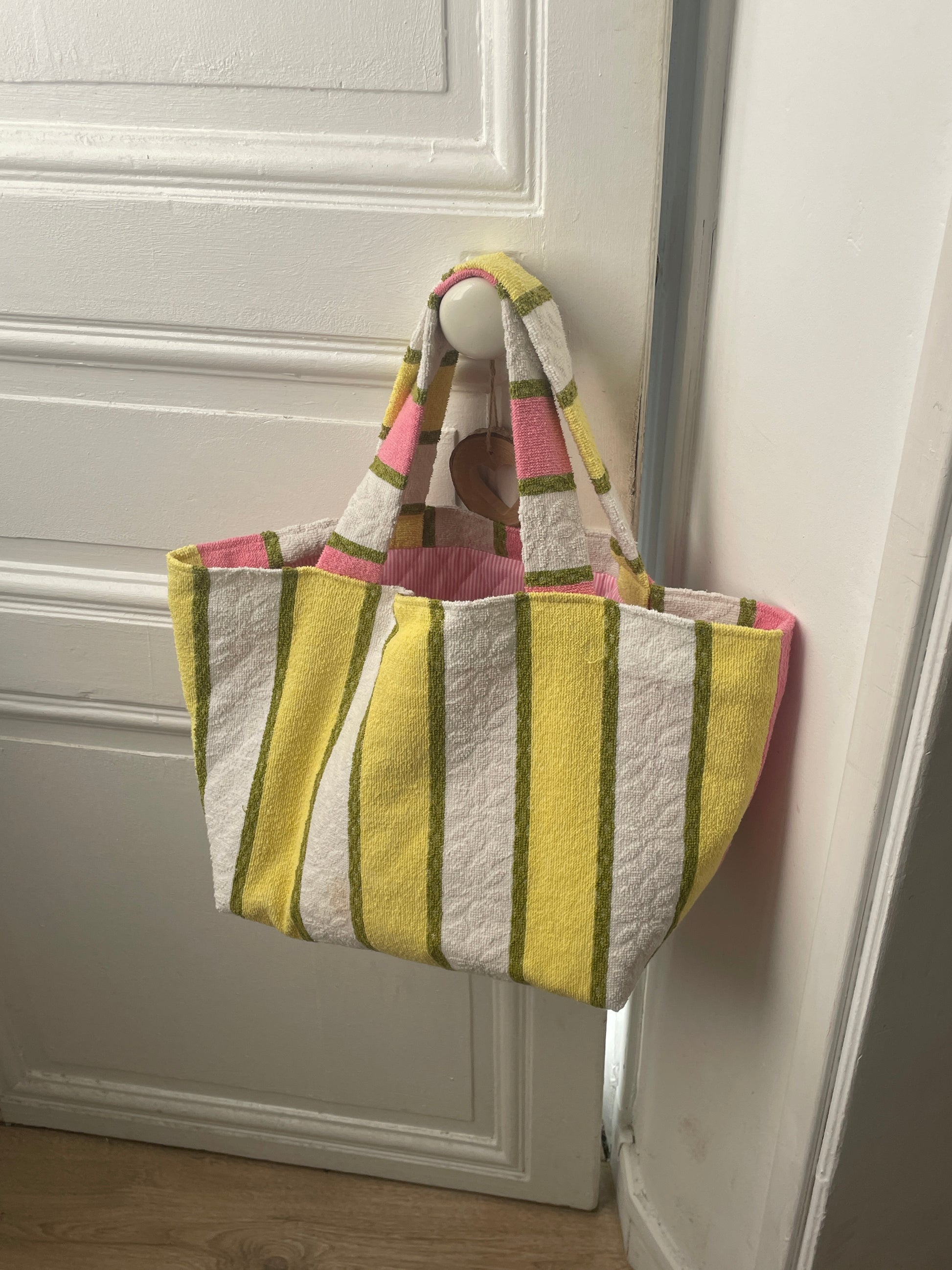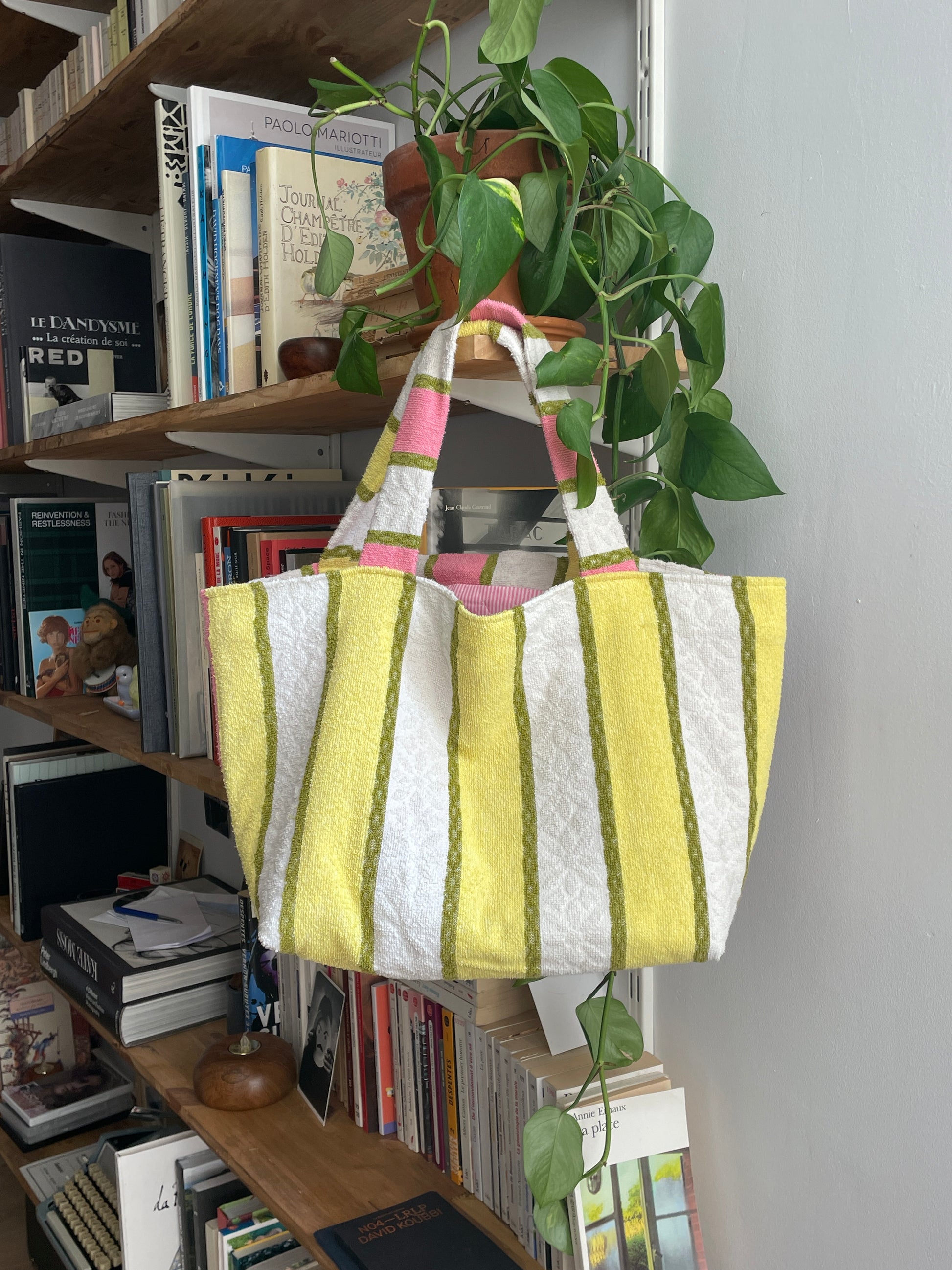 Sac cabas réalisé à partir de serviettes vintage en éponge 🍋. Entièrement cousu par nos soins à Nantes. Doublure matelassée à rayures qui apporte une belle tenue au sac. Poche plaquée intérieure.