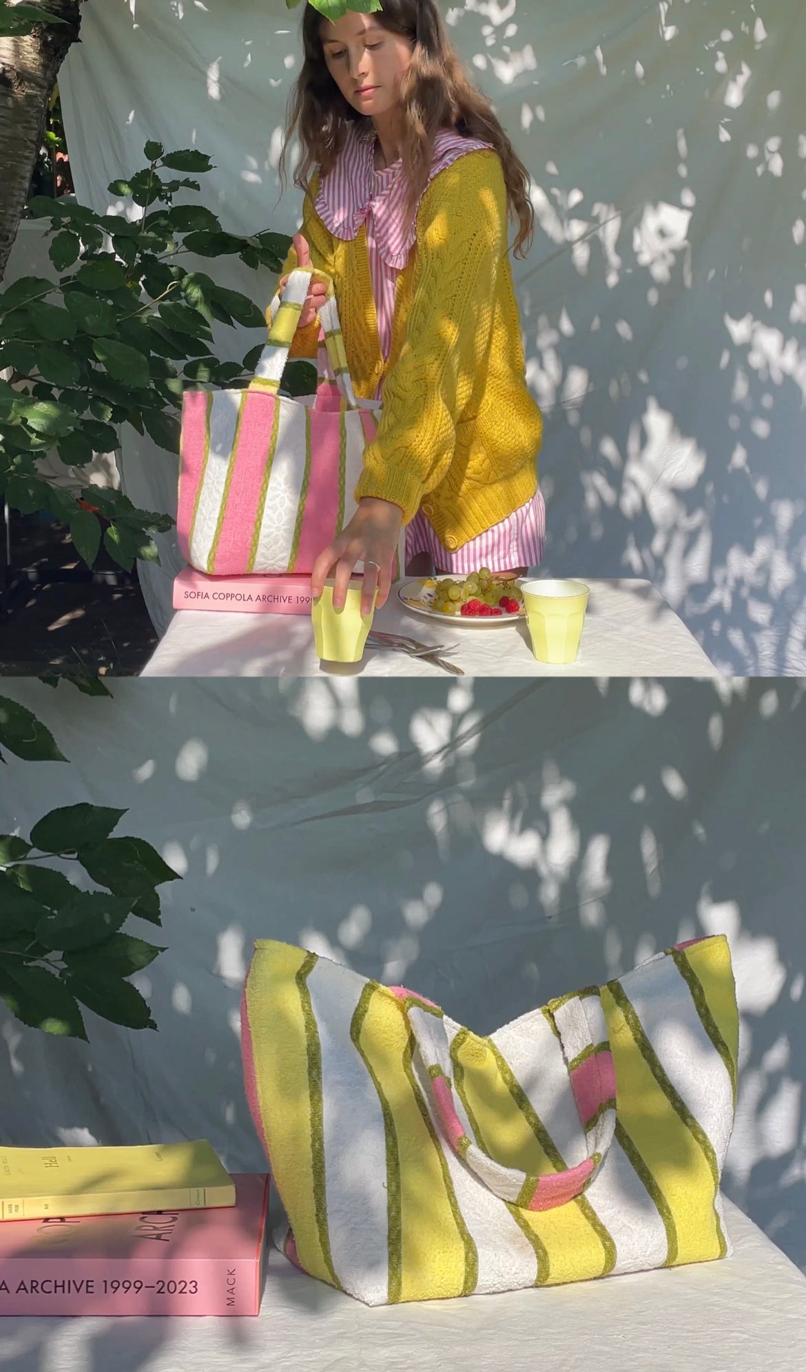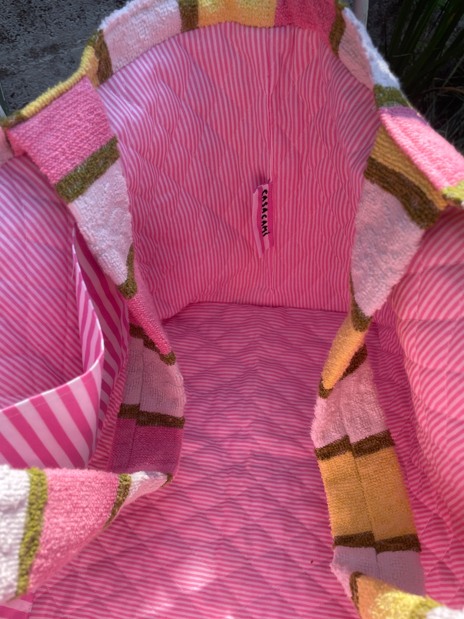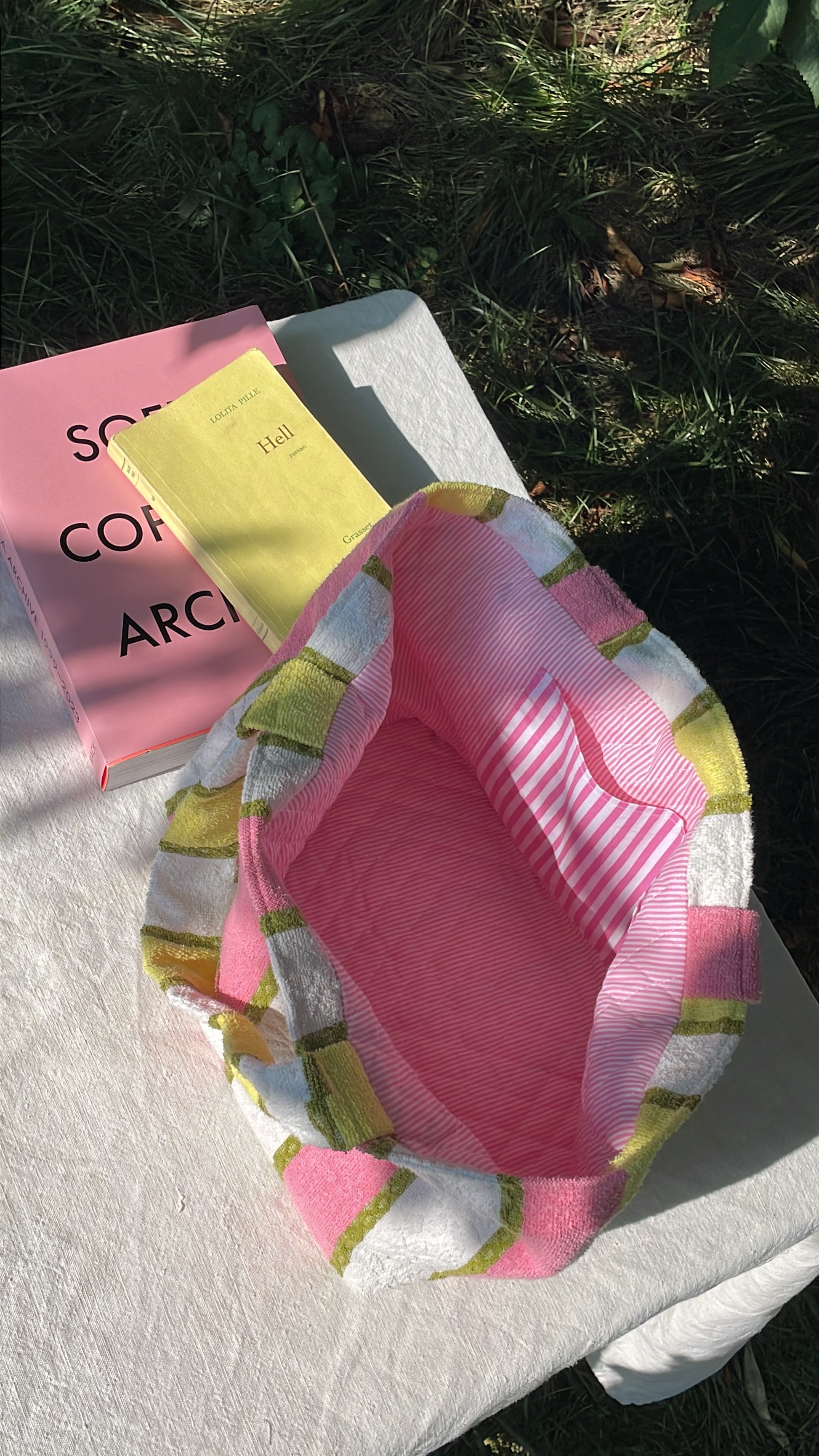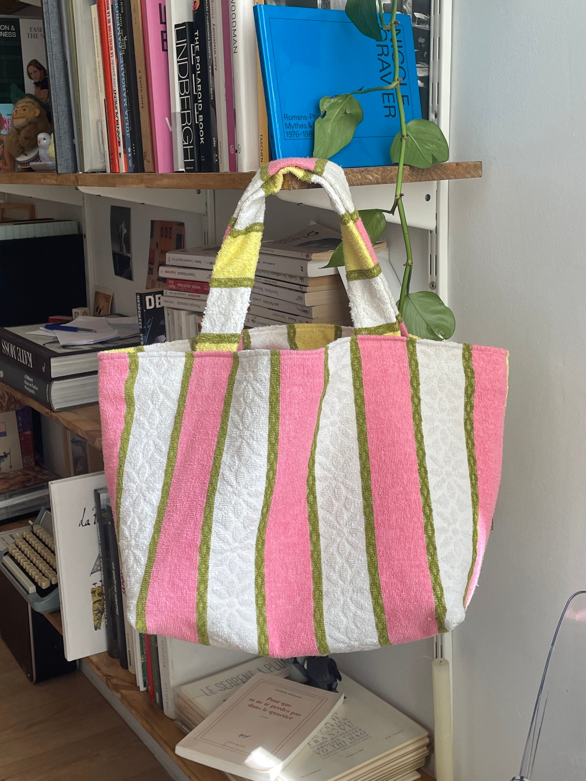 Sac cabas réalisé à partir de serviettes vintage en éponge 🍋. Entièrement cousu par nos soins à Nantes. Doublure matelassée à rayures qui apporte une belle tenue au sac. Poche plaquée intérieure.