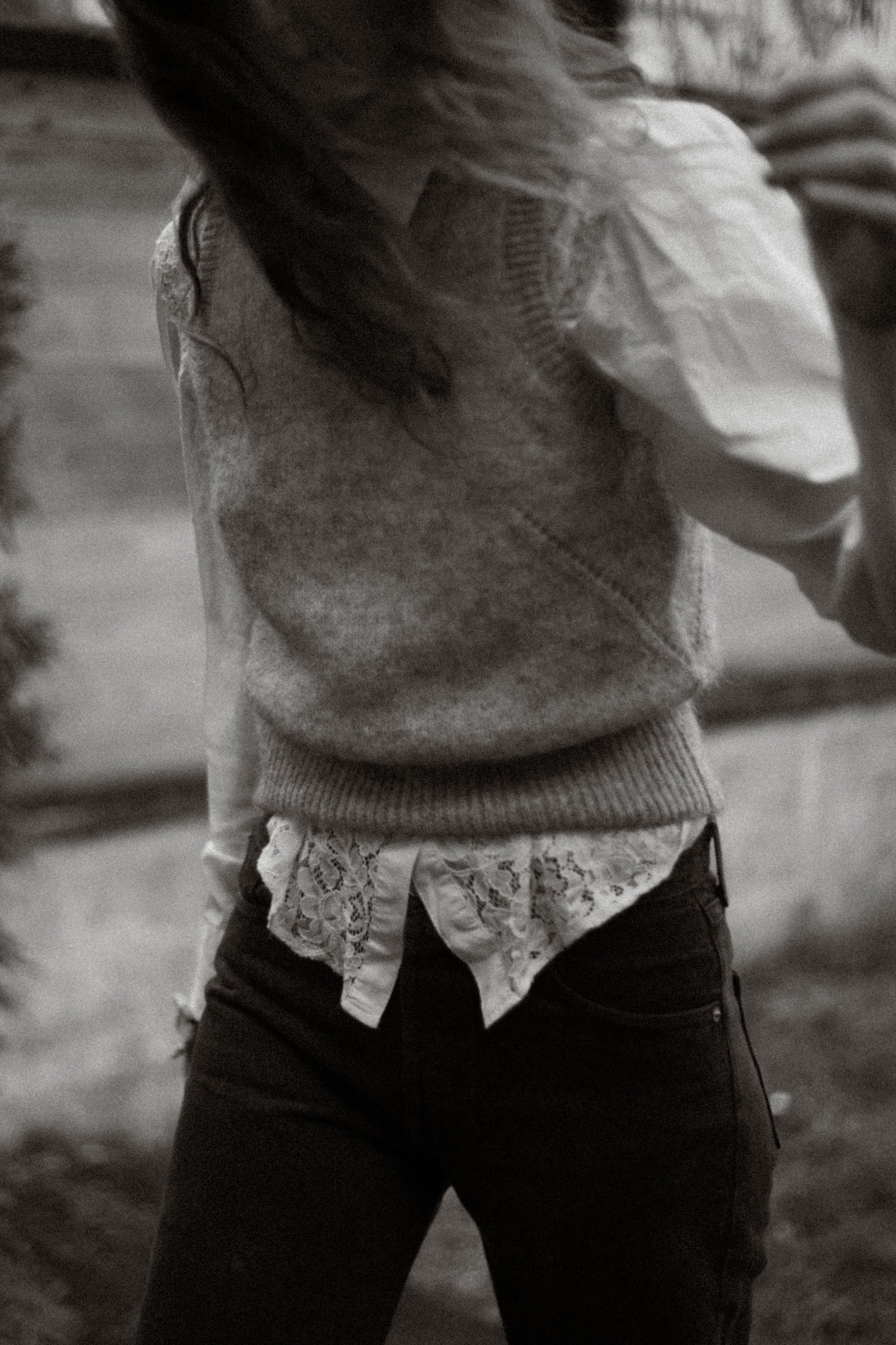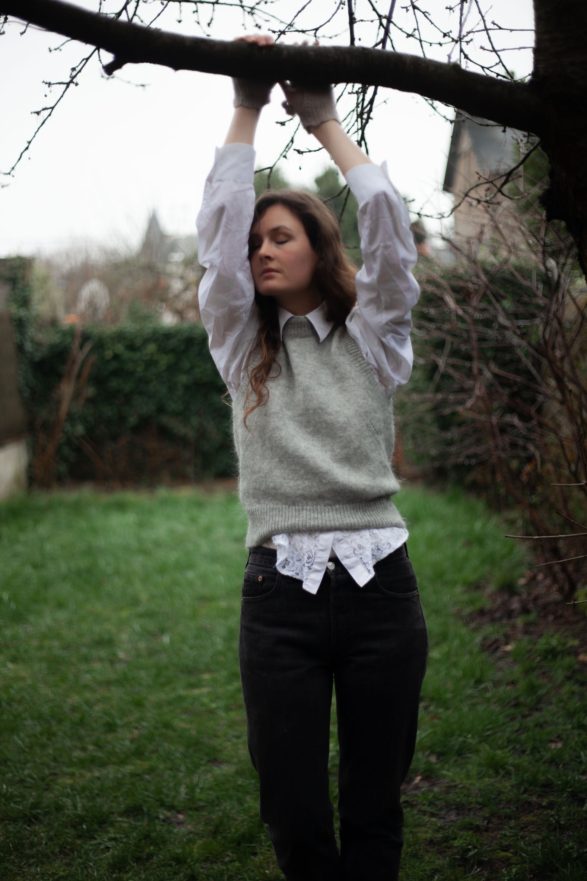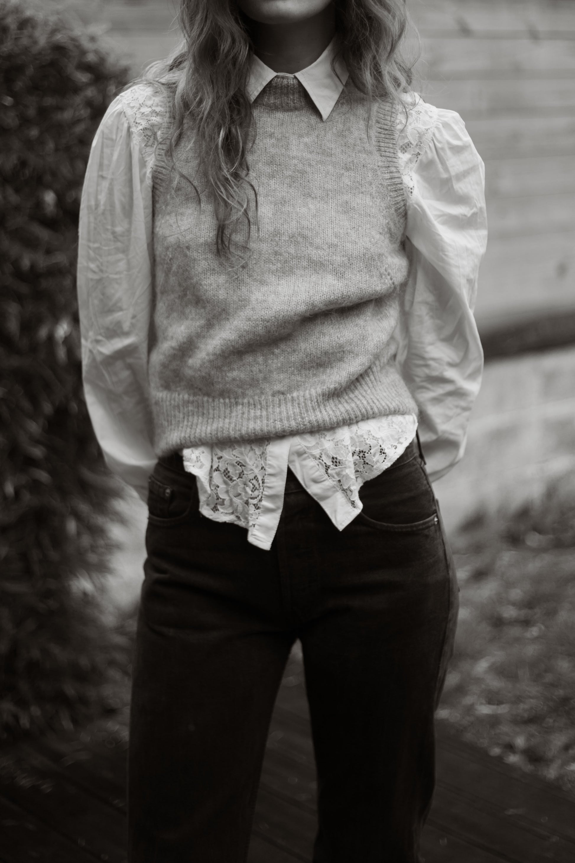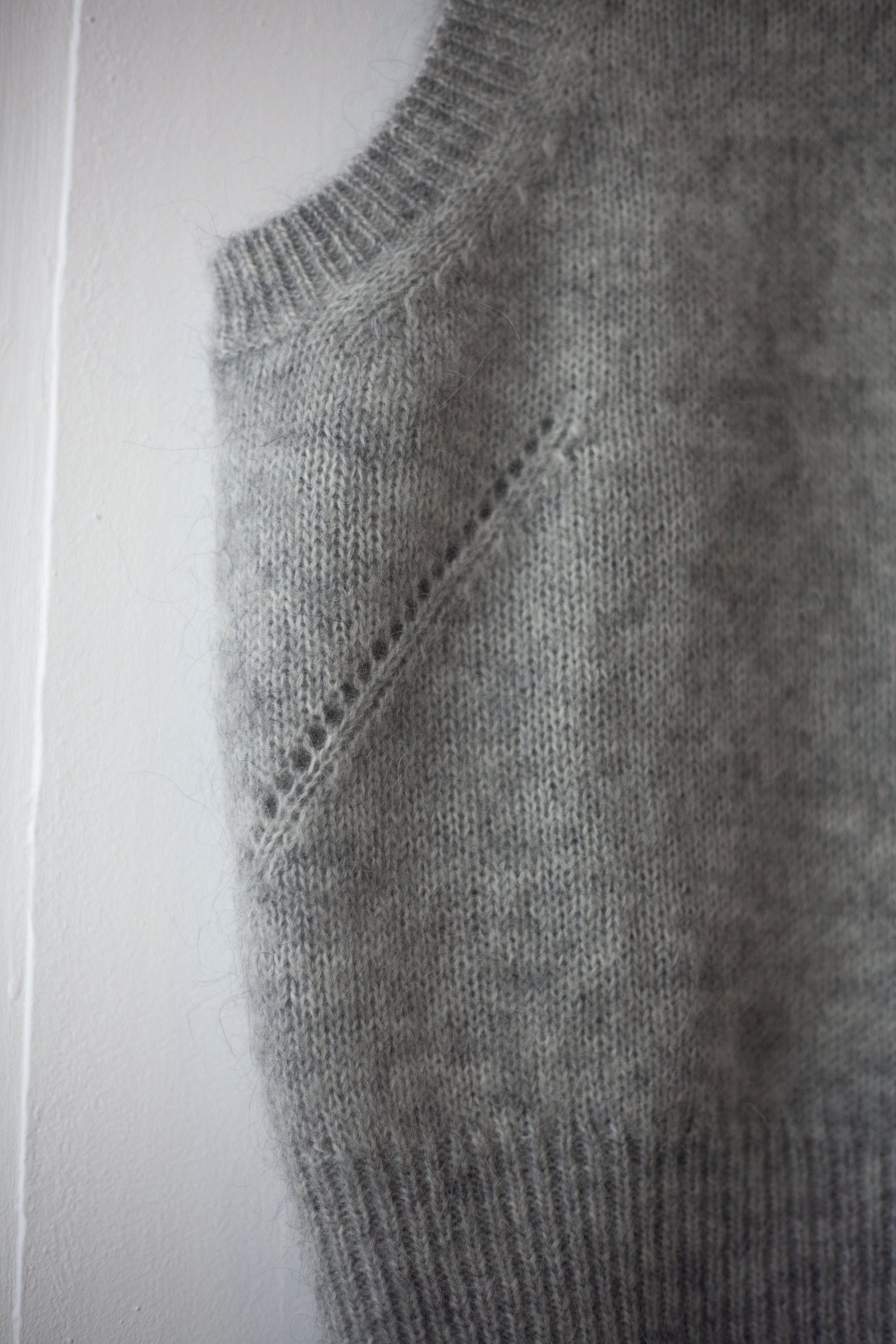 Pull en laine mélangée (60%) Kookai. Taille XS, peut aussi convenir à une taille S. Coupe débardeur. Bords côtes et joli point dentelle. Gris clair.