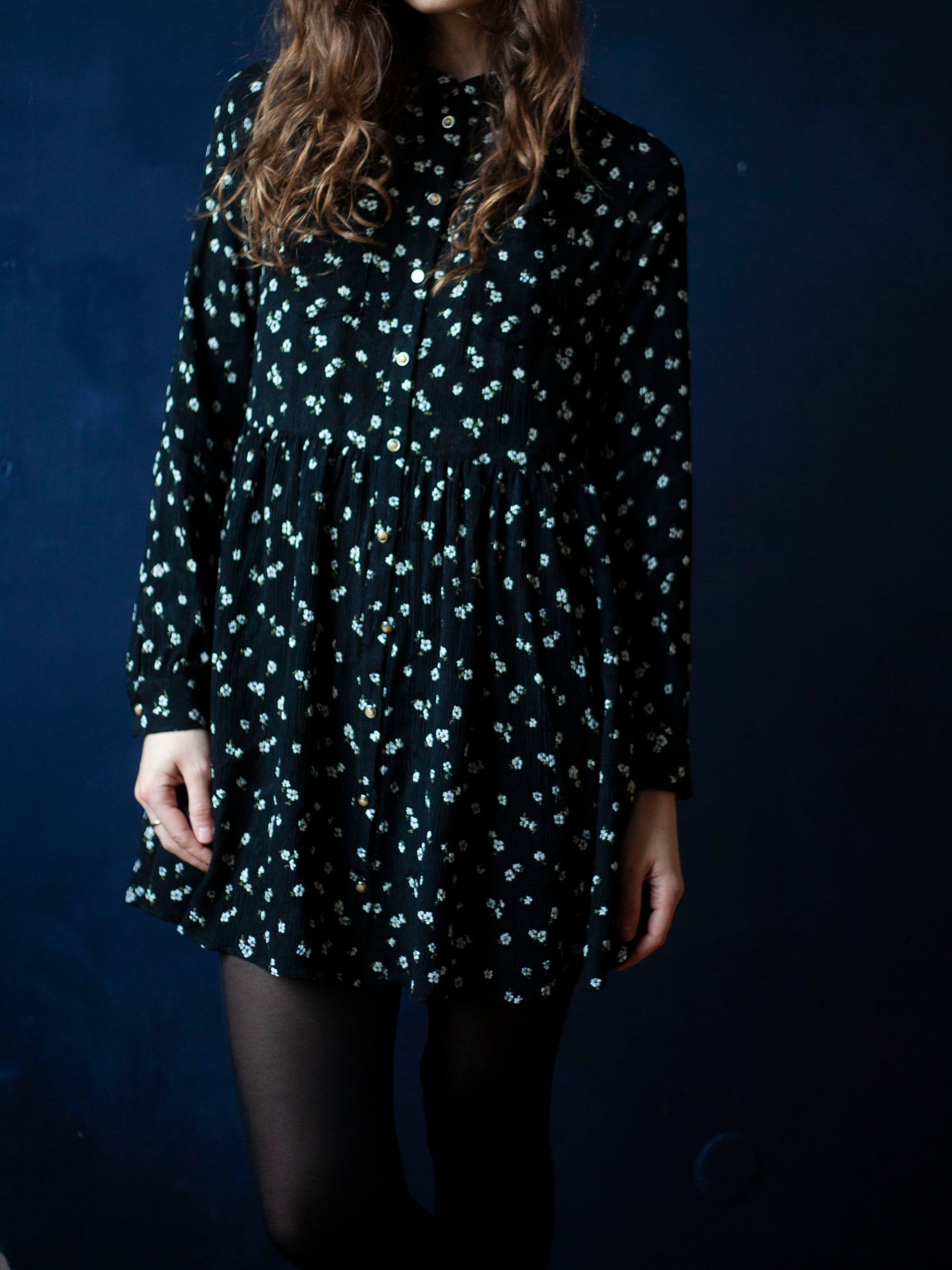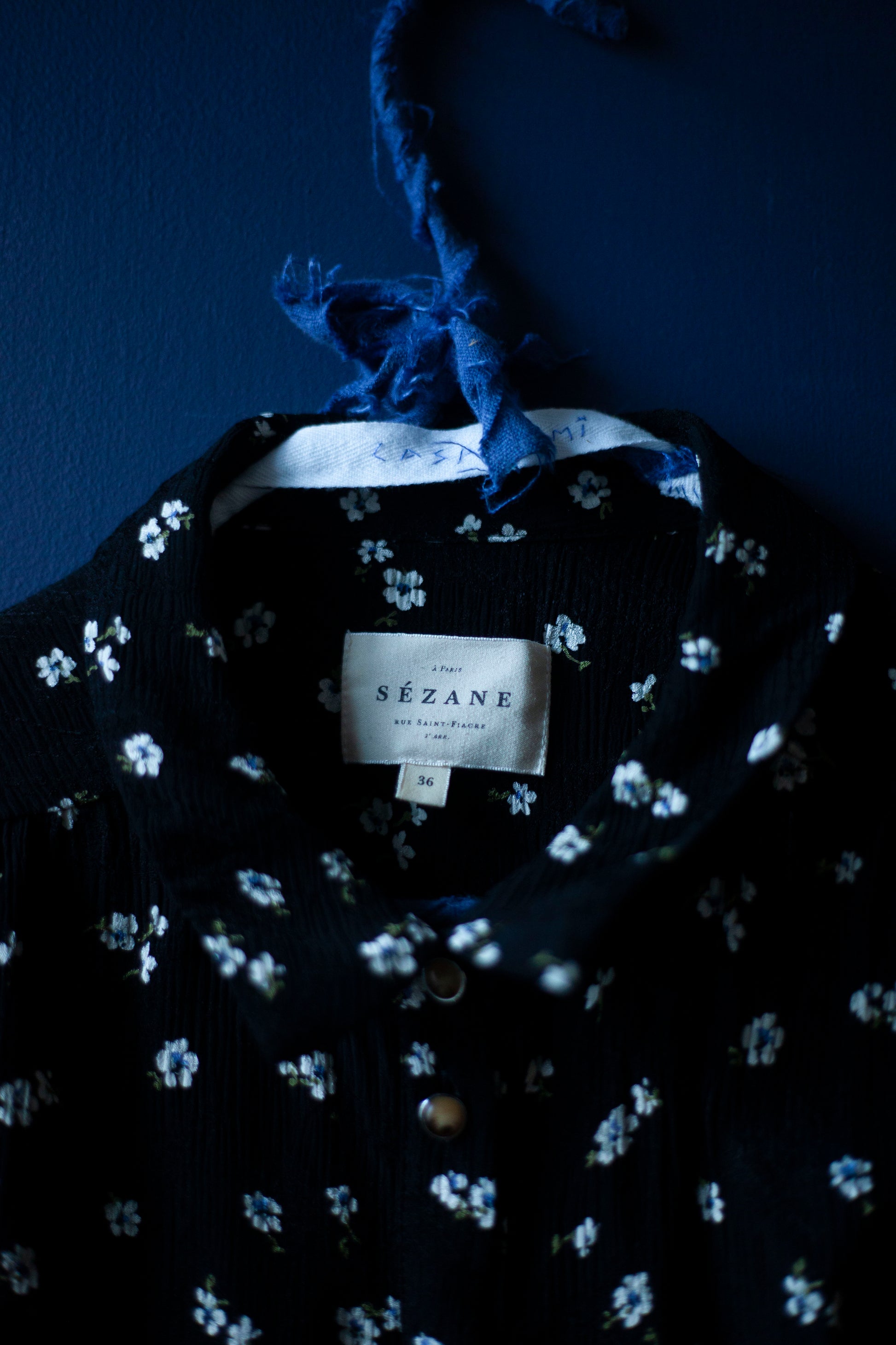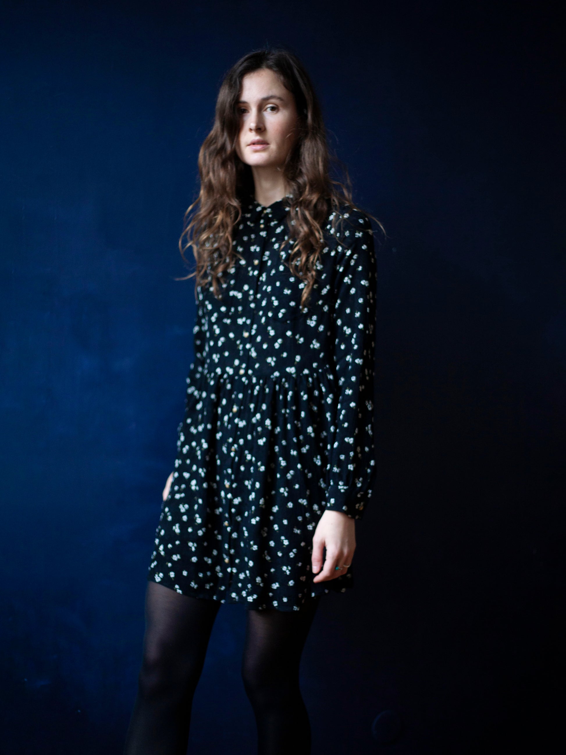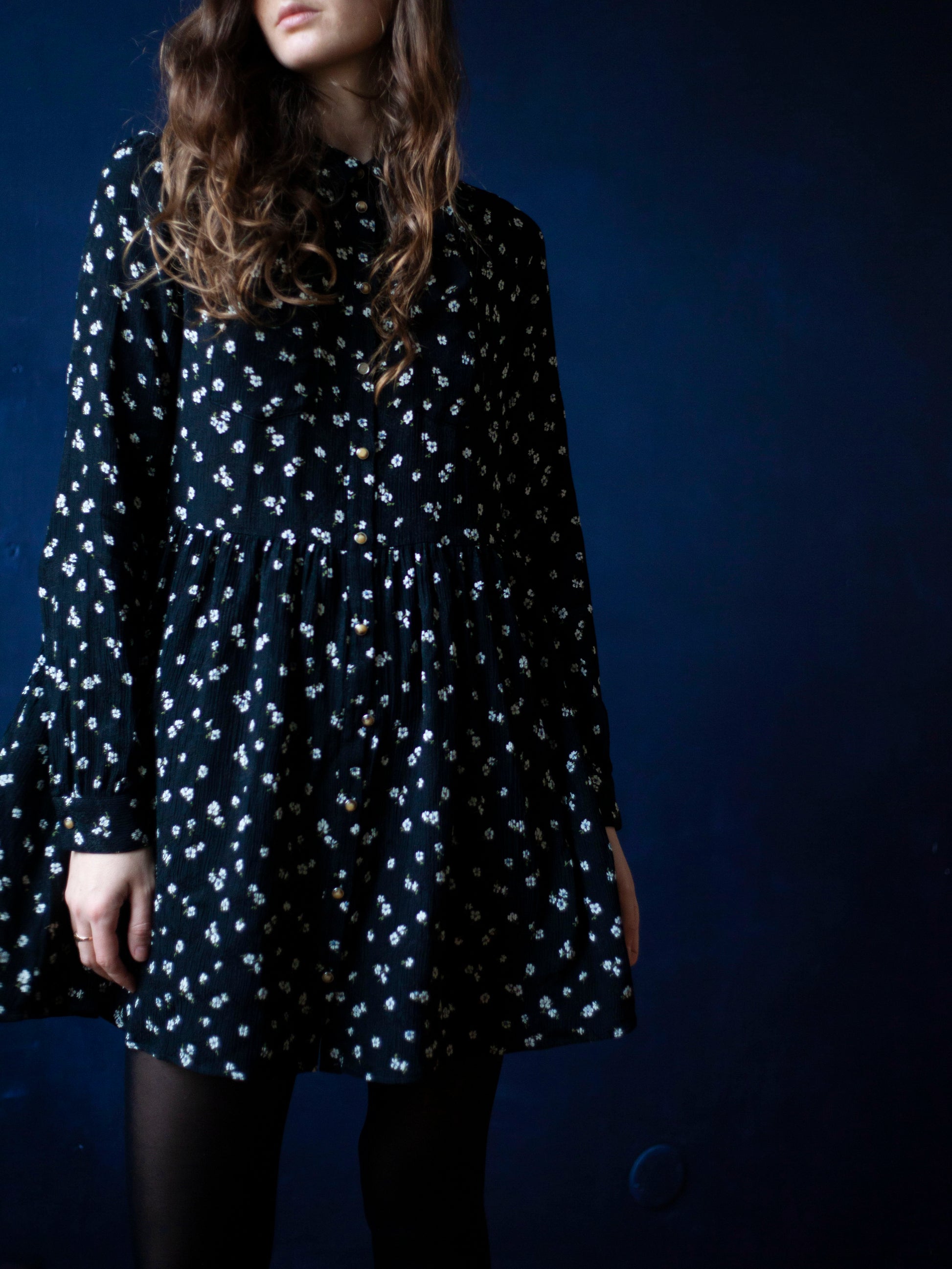 Robe noire boutonnée Sézane. Modèle "Léana". Coupe courte babydoll, taille froncée. Imprimé fleuri japonisant sur fond noir plissé.