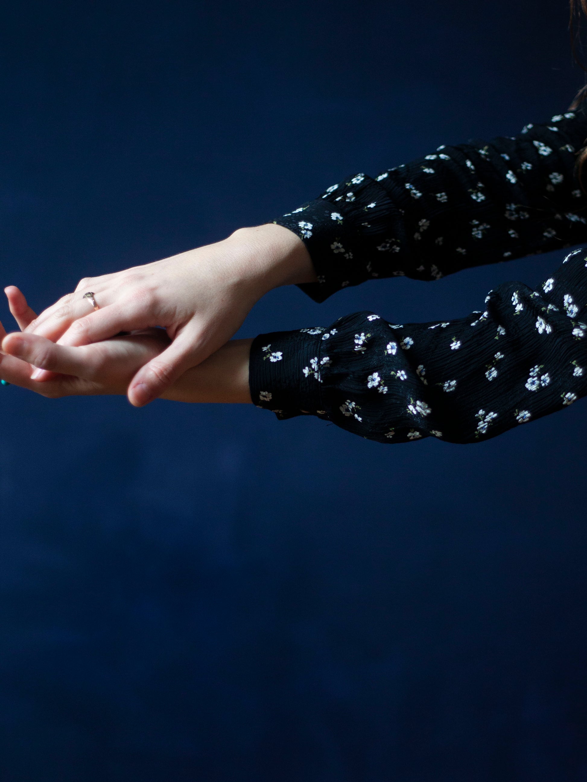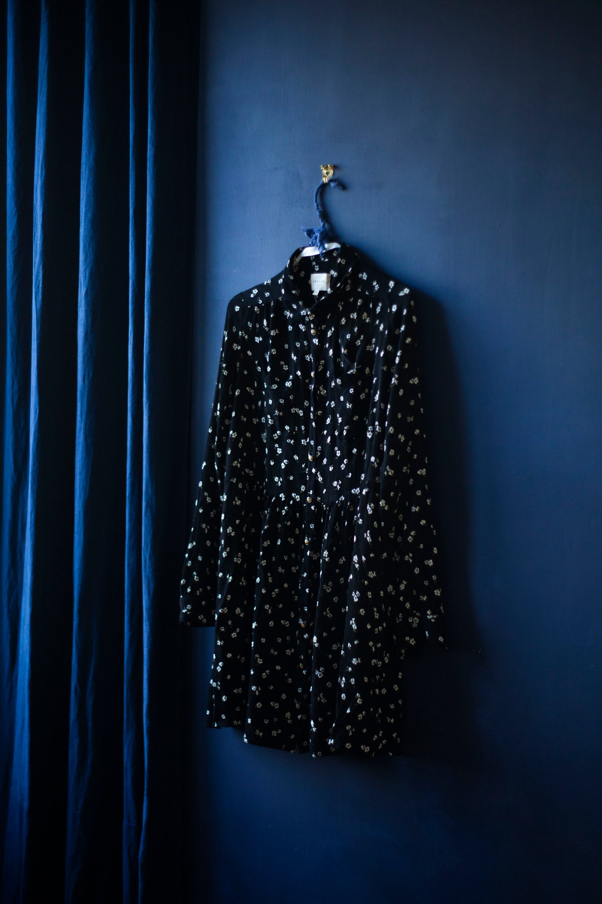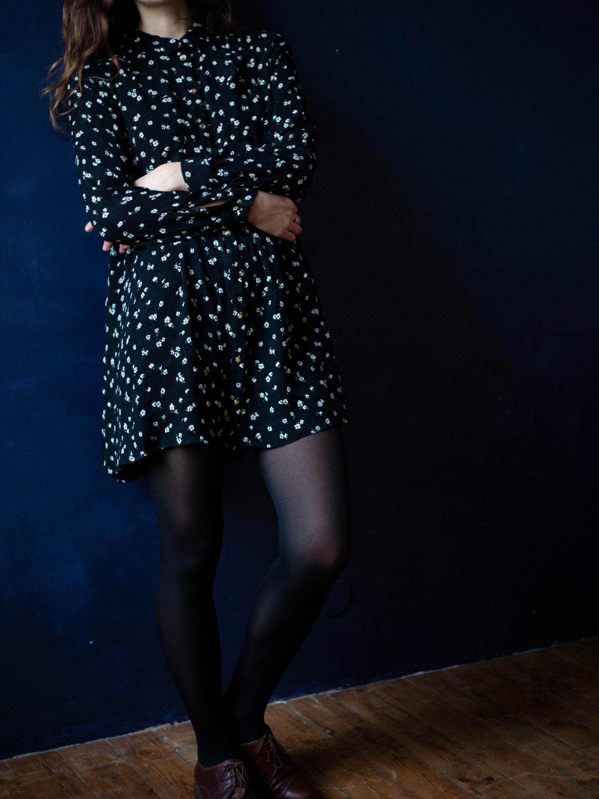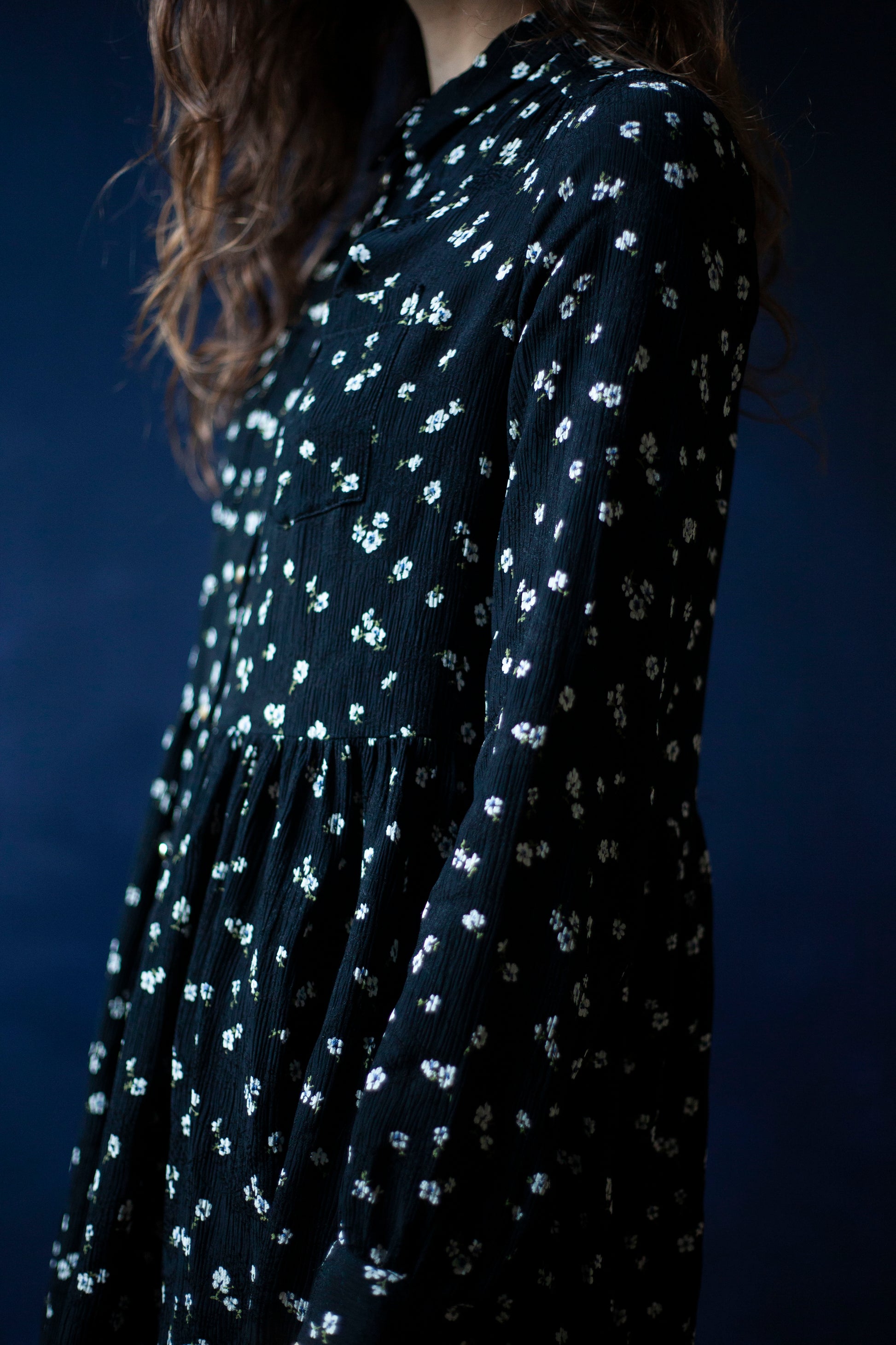 Robe noire boutonnée Sézane. Modèle "Léana". Coupe courte babydoll, taille froncée. Imprimé fleuri japonisant sur fond noir plissé.