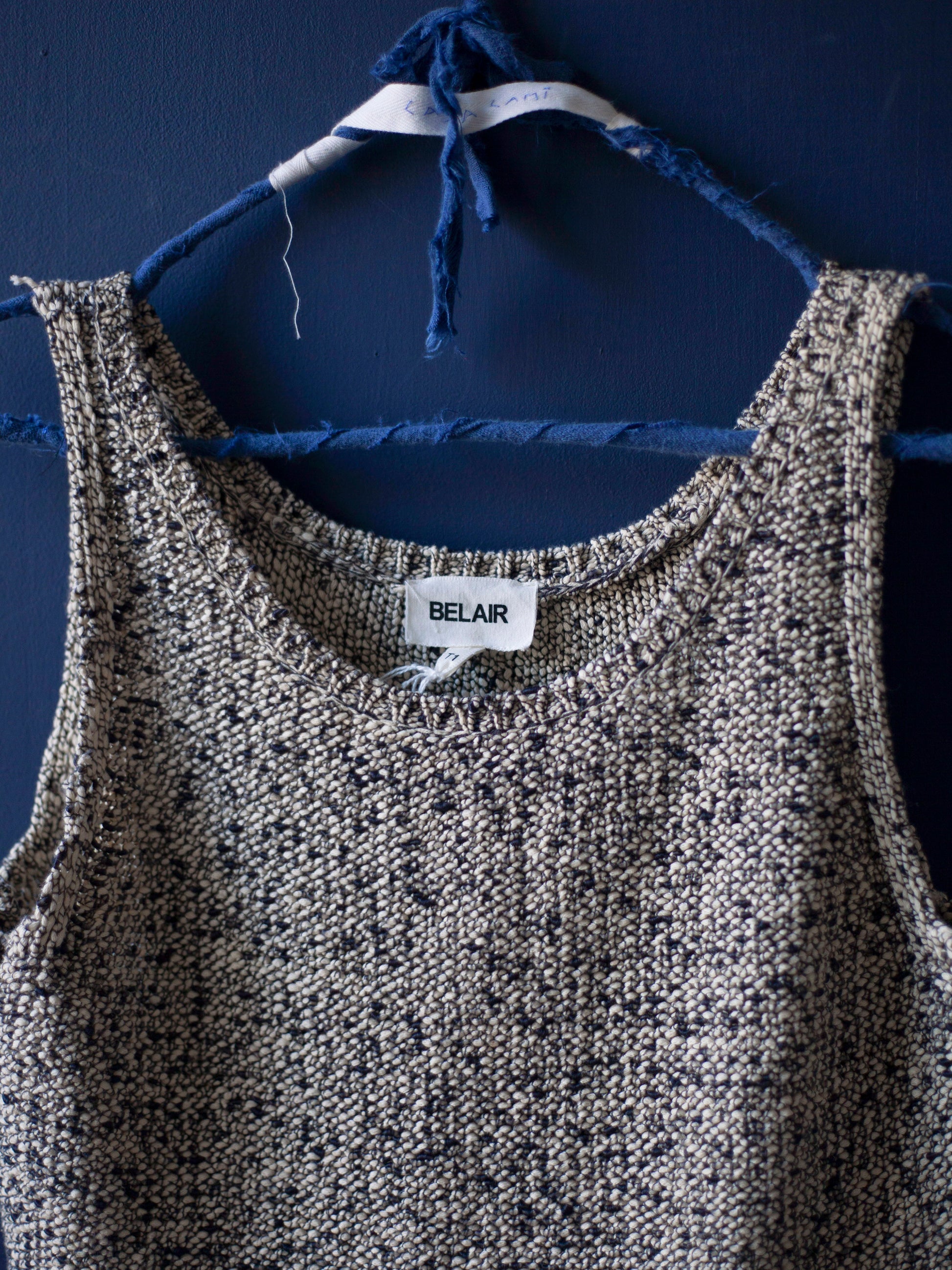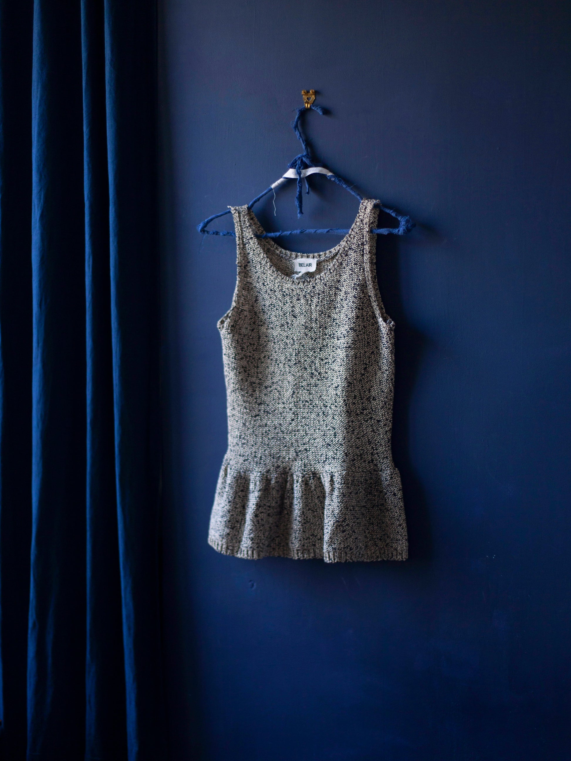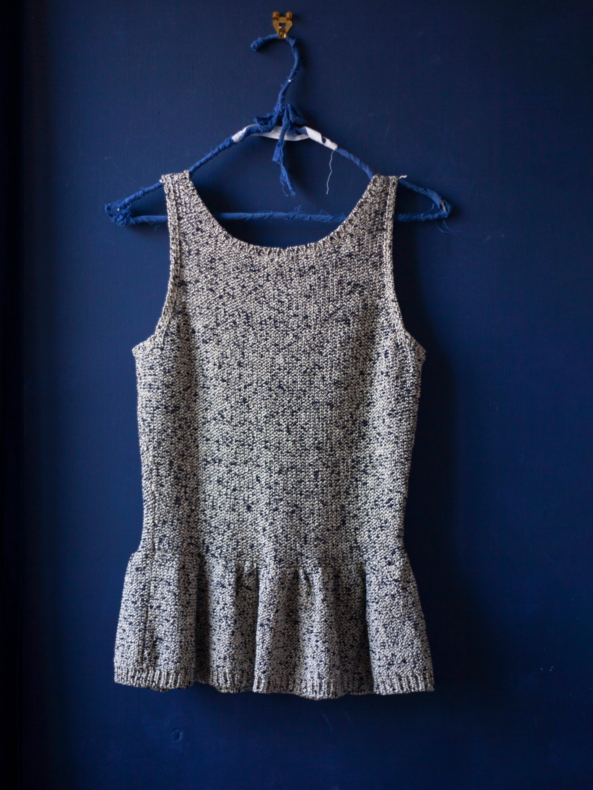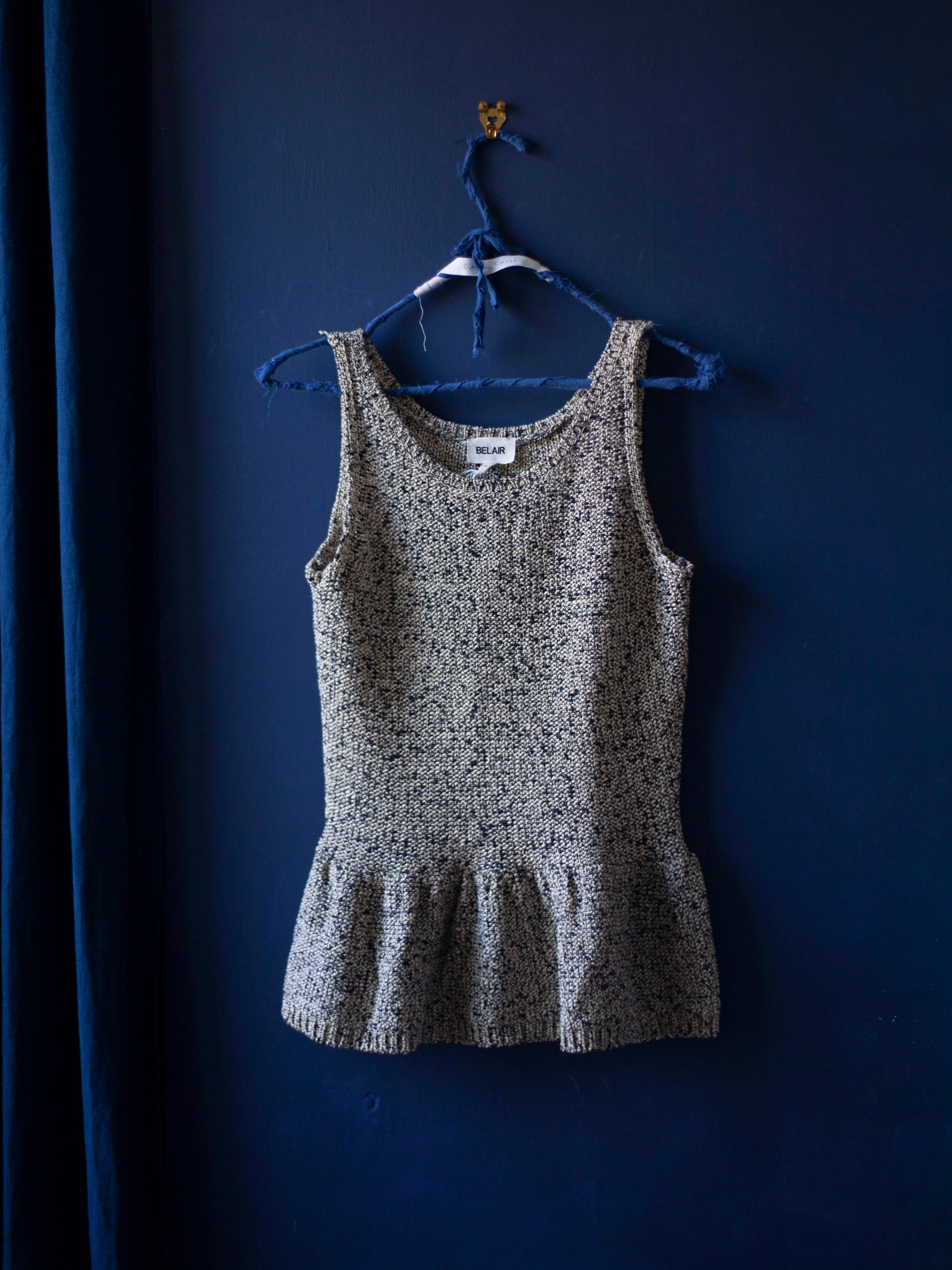 Joli débardeur en maille Bel Air gris chiné. Les volants créent un volume intéressant. Très bon état. Taille 1 : correspond à une taille S.