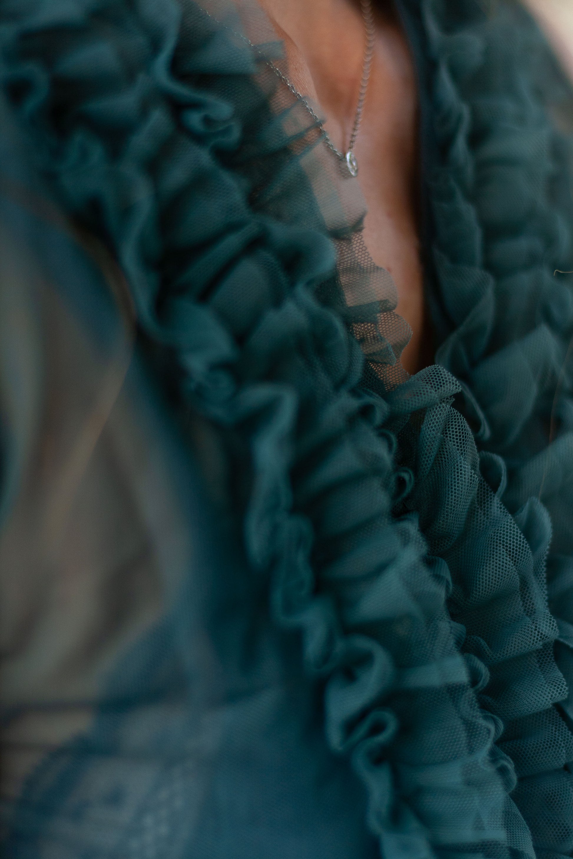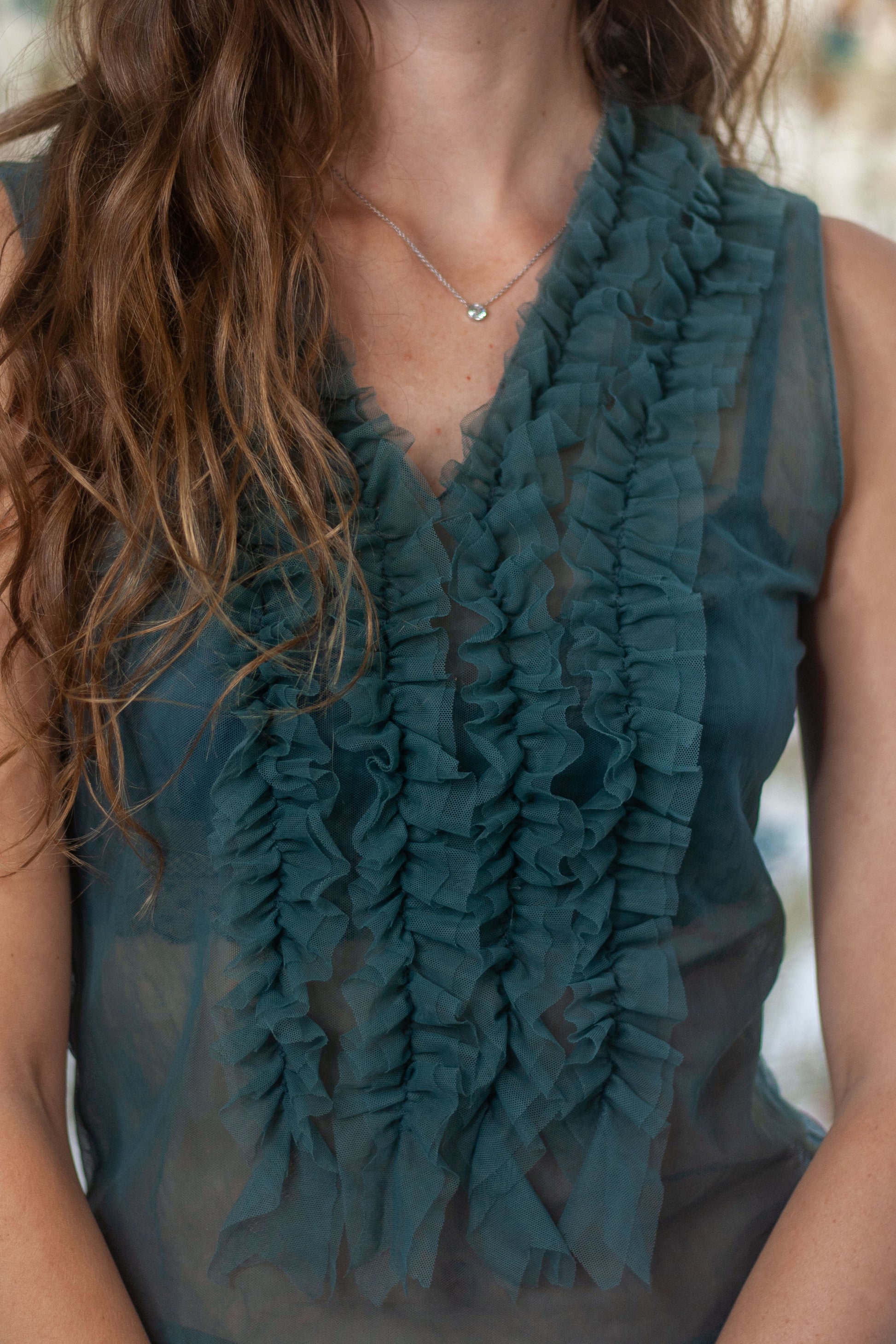 Haut transparent en tulle bleu canard Briefing vintage (Galeries Lafayette). Décolleté bordé de froufrous. Tout en transparence. À porter en layering ou façon dessous-dessus.