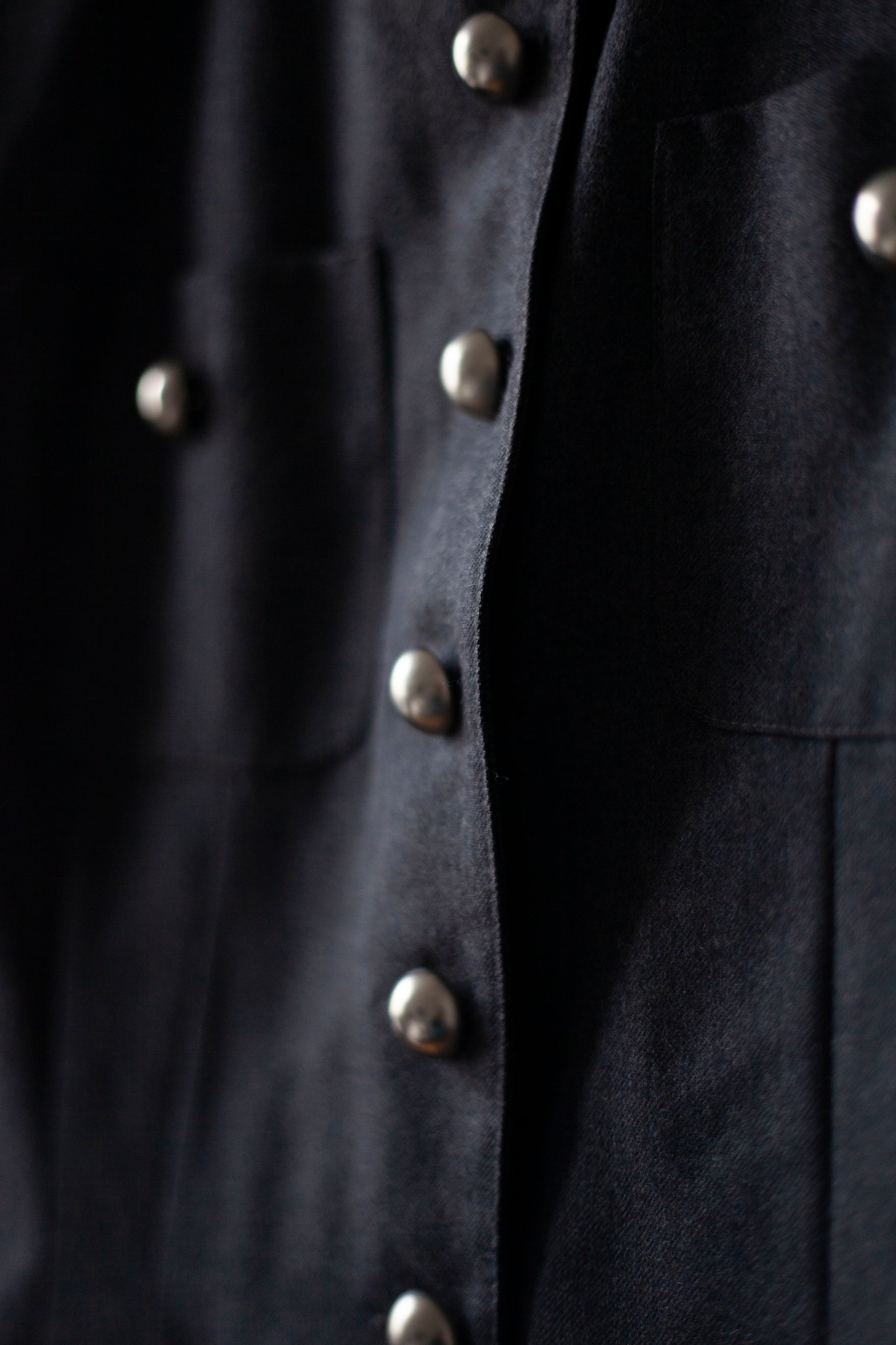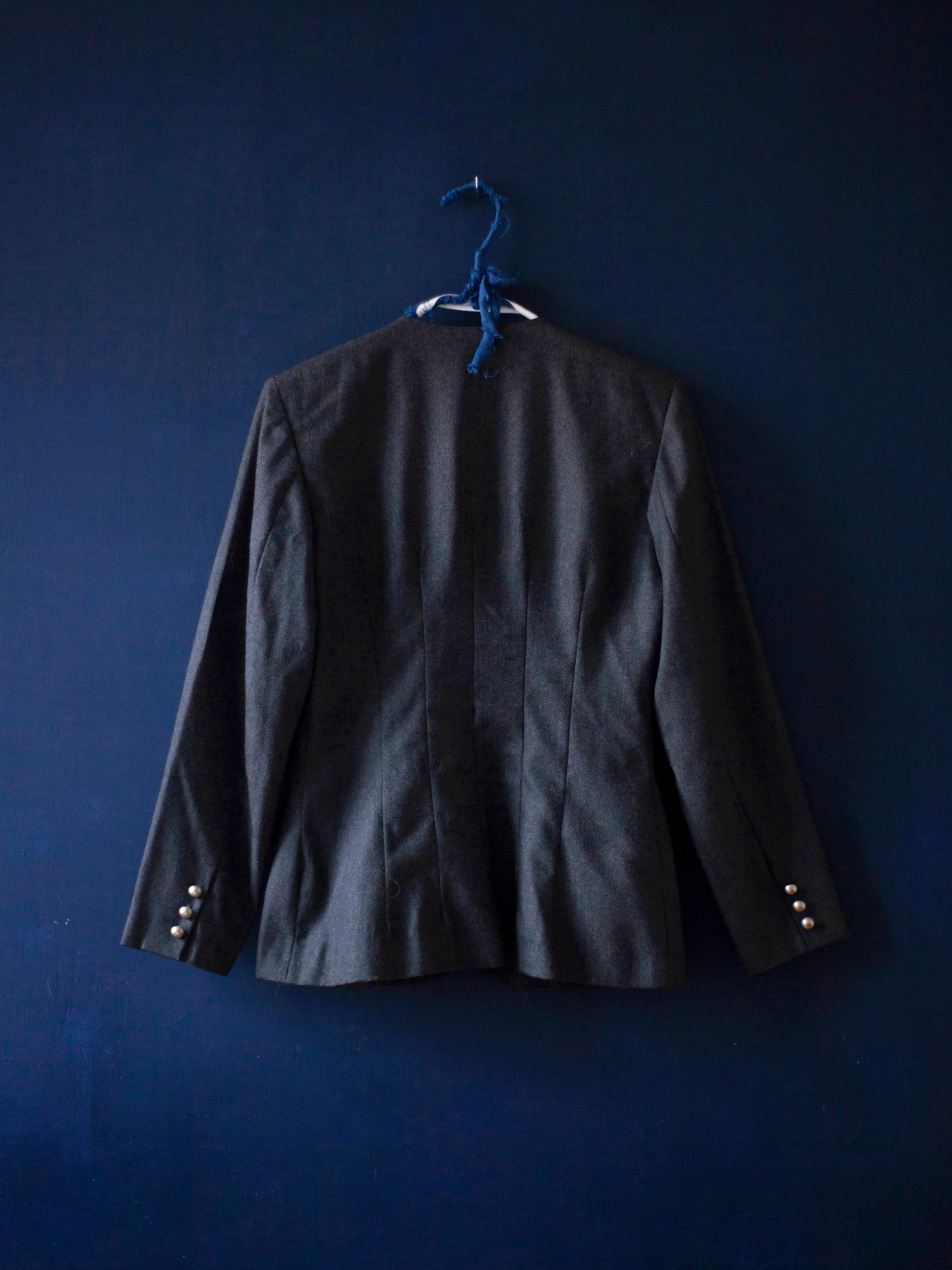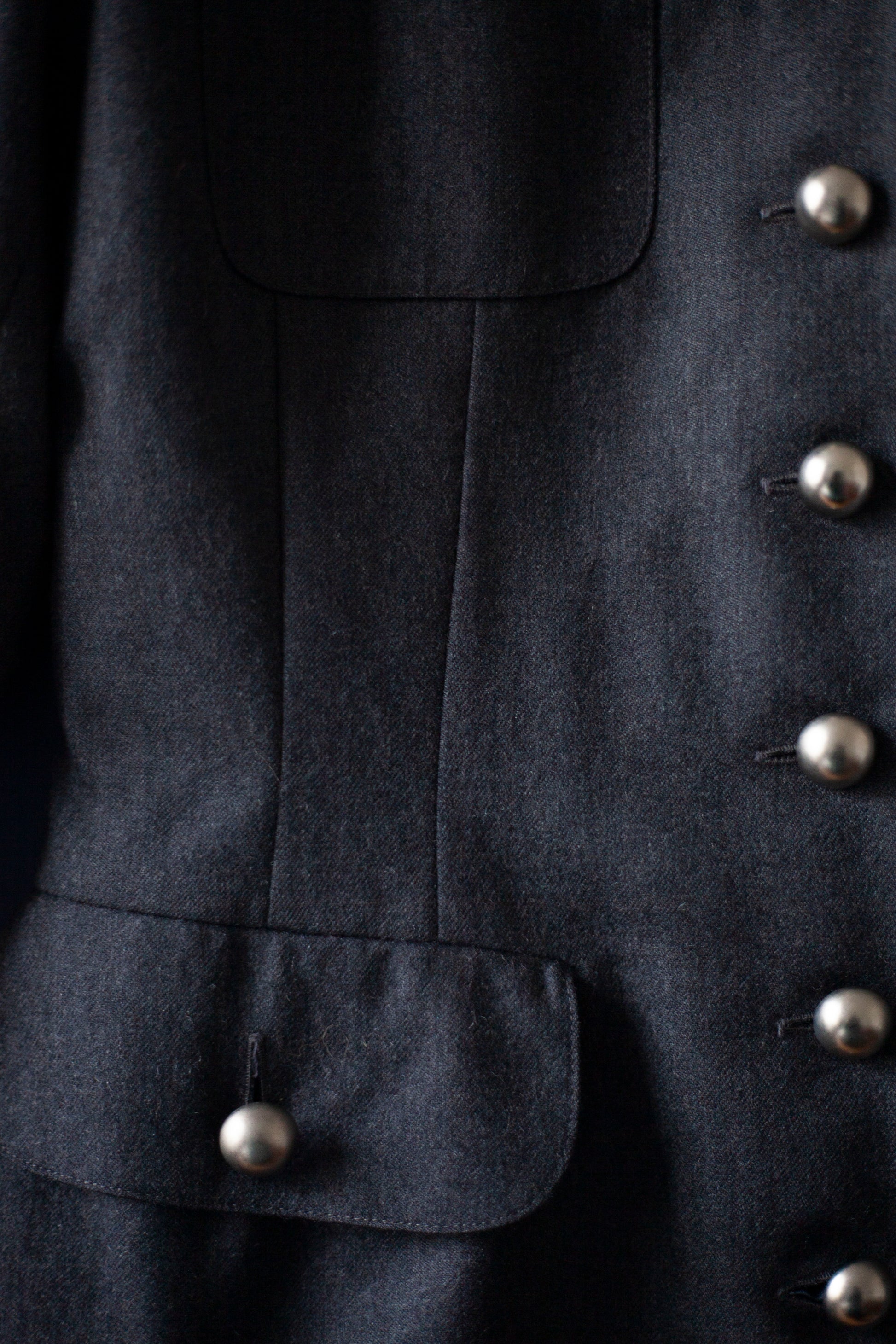 Veste d'officier vintage Cacharel. Gris anthracite. Fabriquée en France. Sublimes finitions : découpe princesse qui souligne la taille, boutons ronds argentés, surpiqûres parfaitement réalisées.