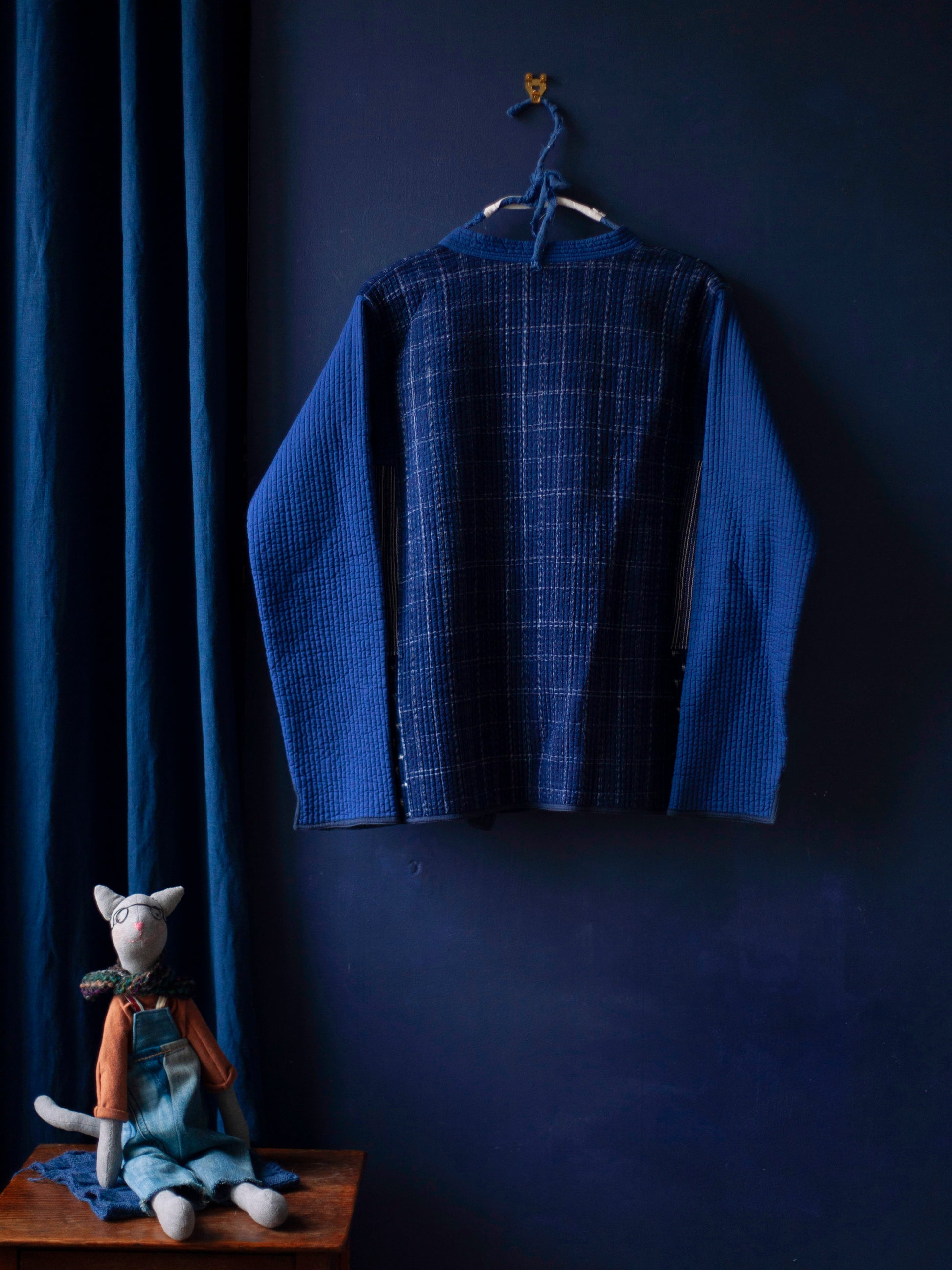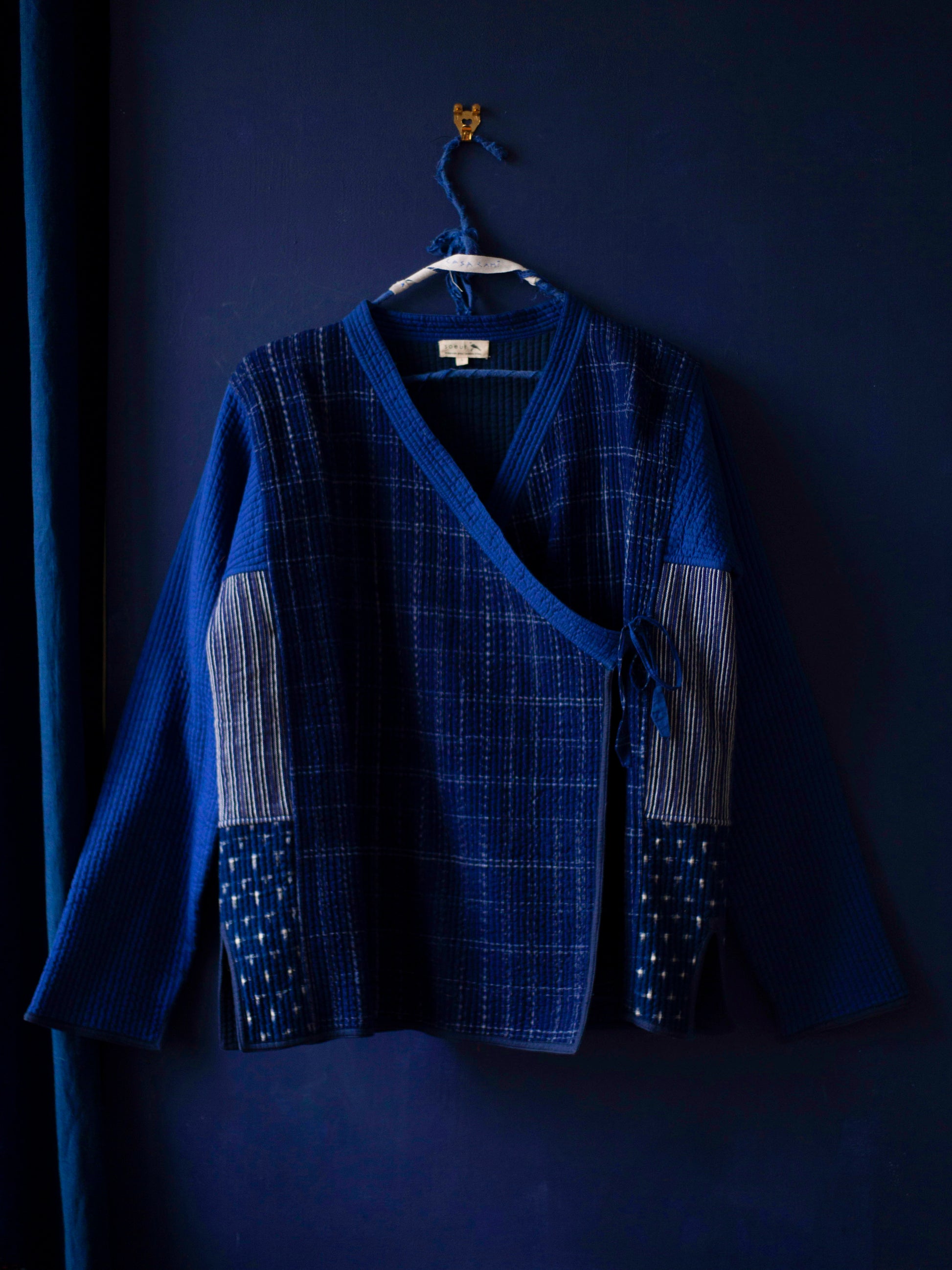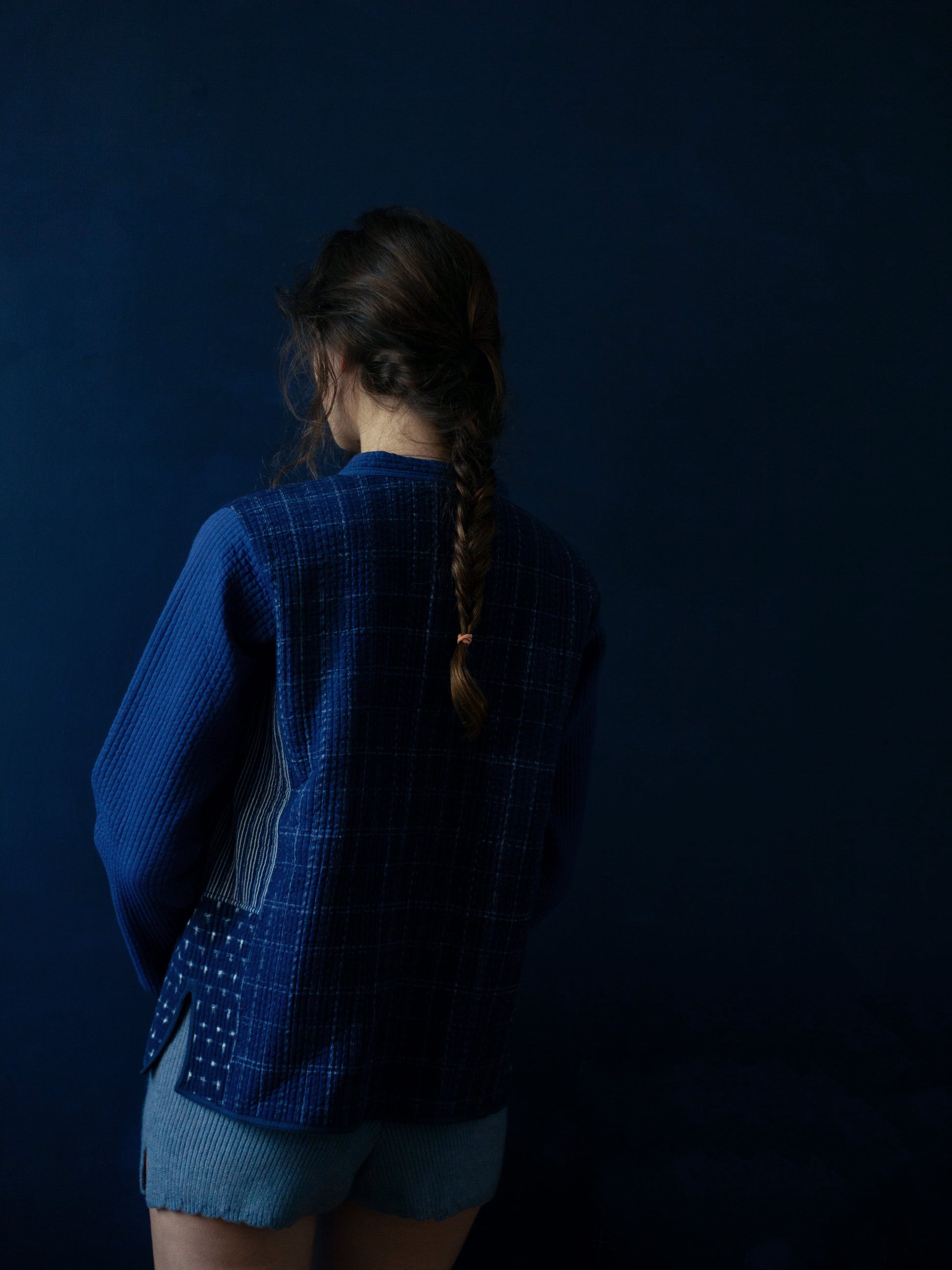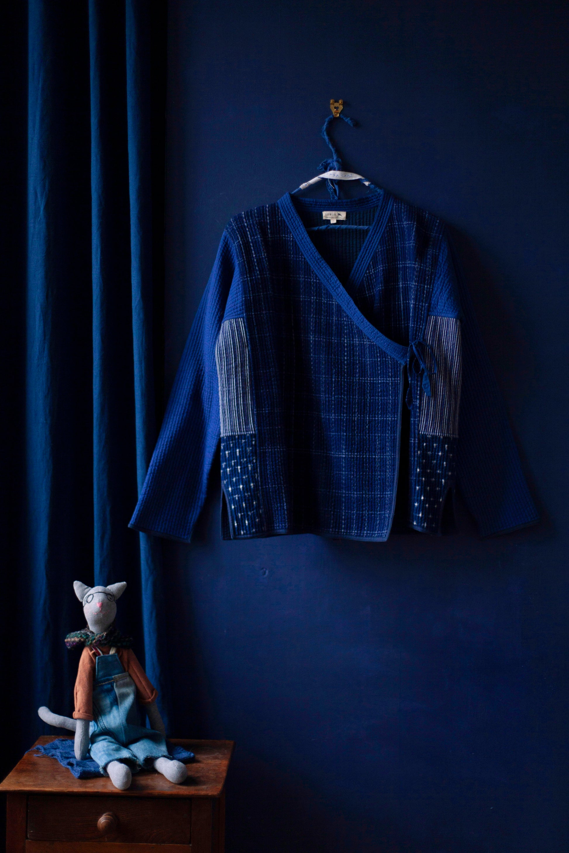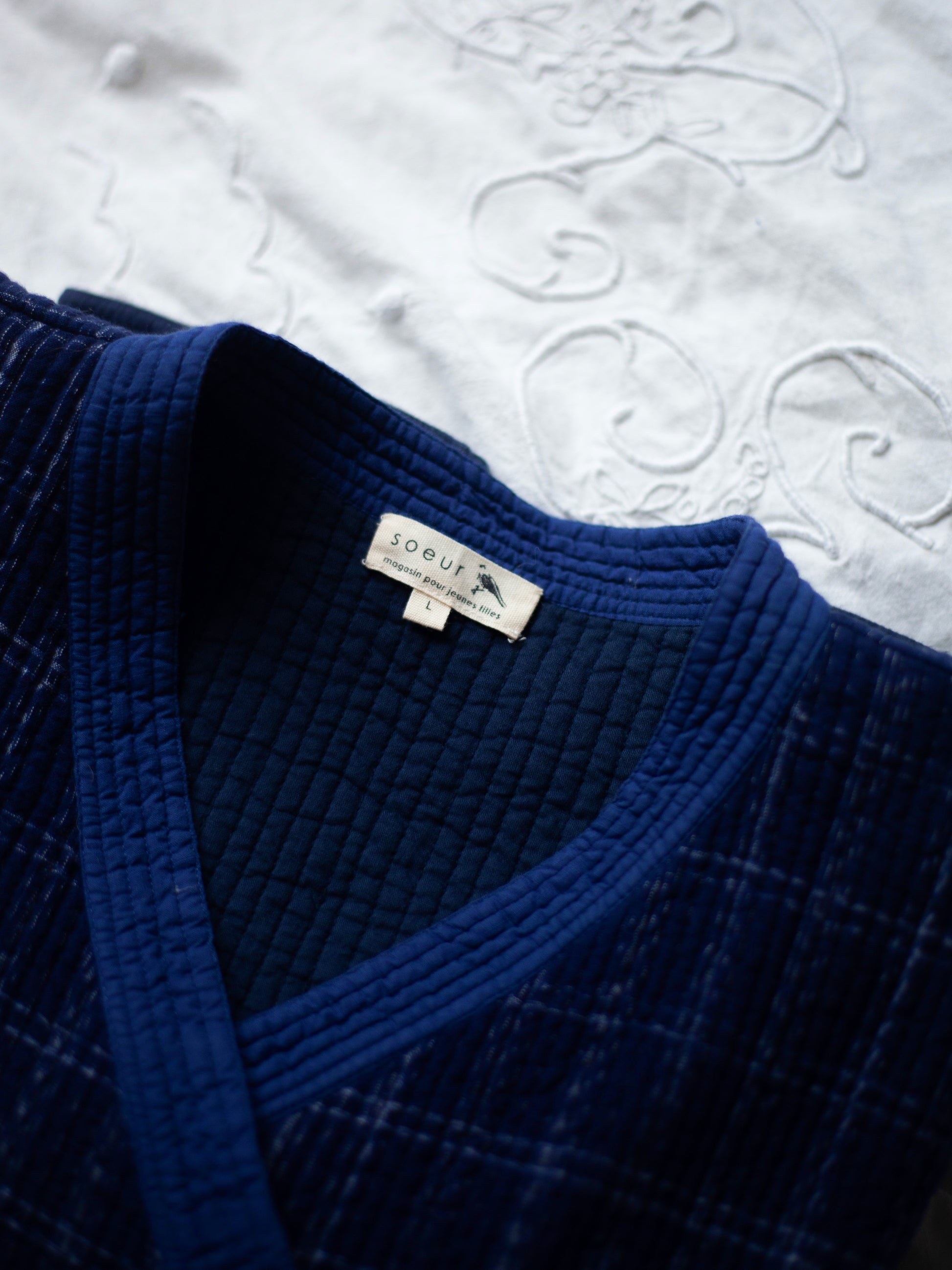 Veste indigo en coton matelassé Soeur. Patchwork de tissus indigos brodés d'après la méthode japonaise du sashiko. Coupe cache-coeur. Taille L, peut aussi convenir à une taille M pour un porté oversized. Parfait état.