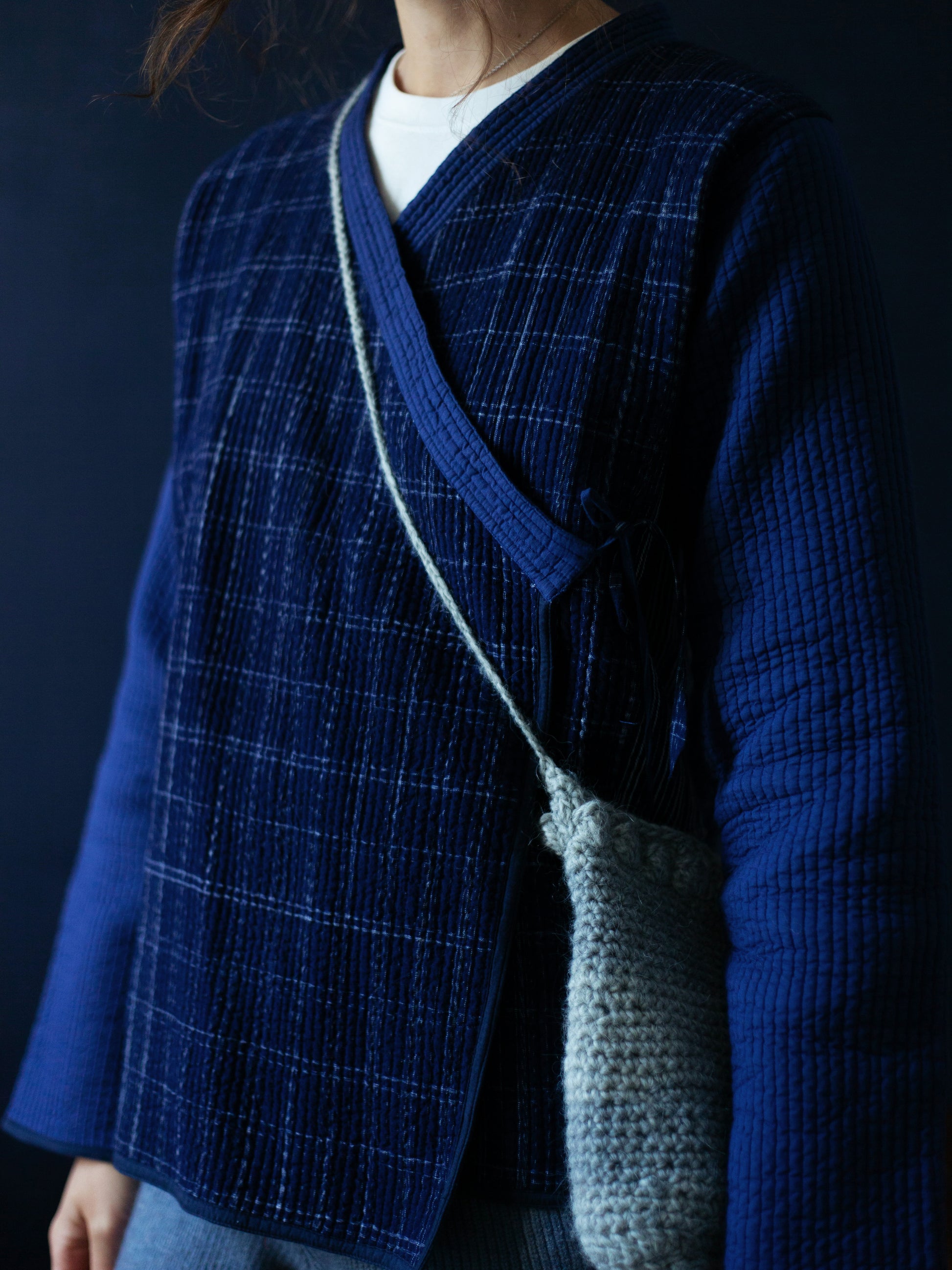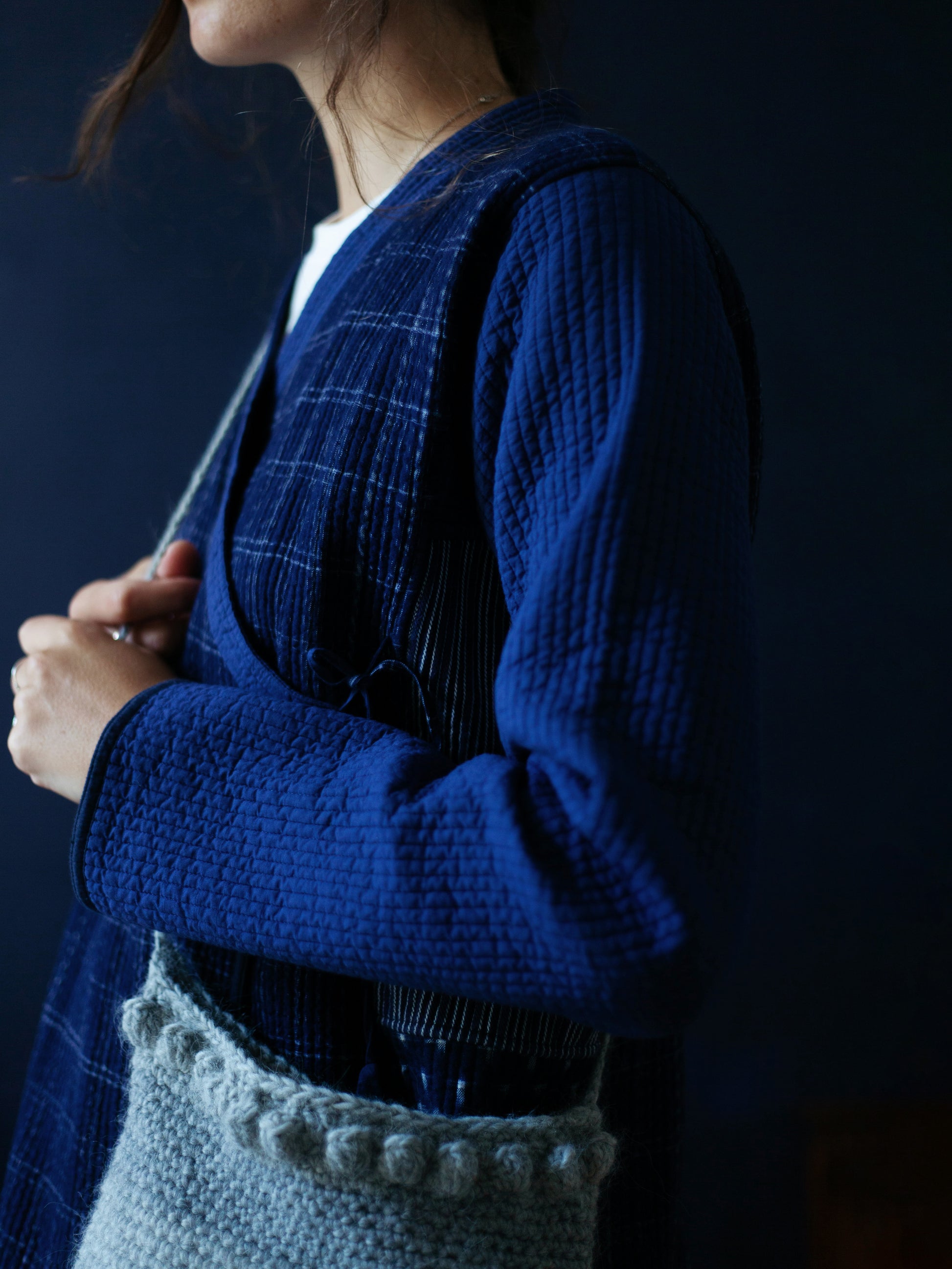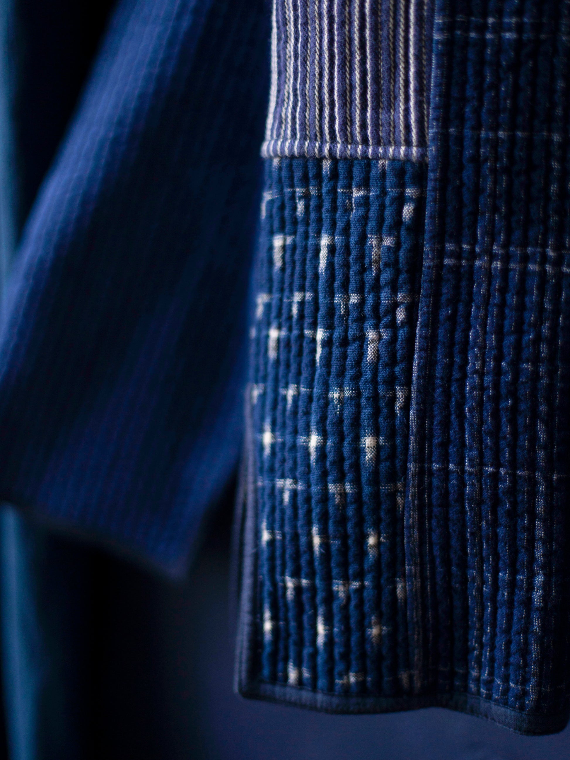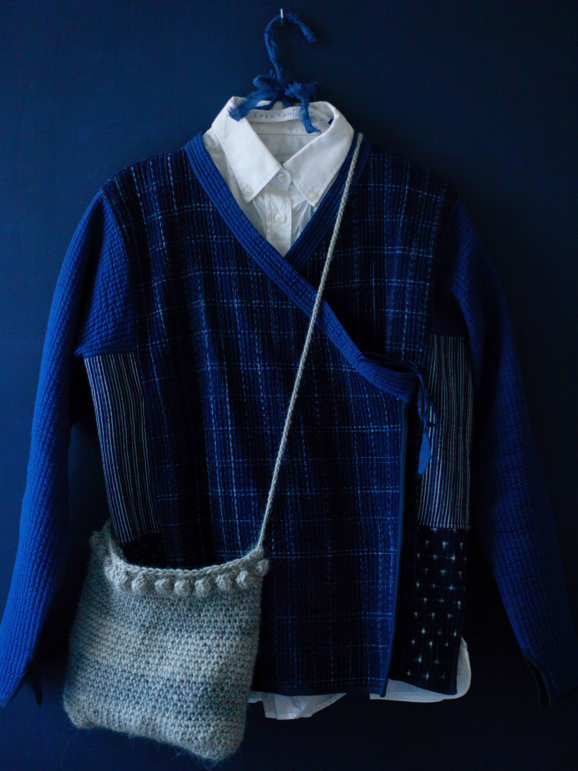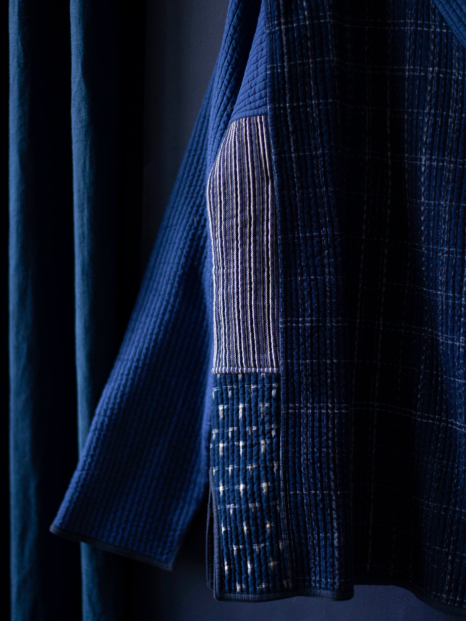Veste indigo en coton matelassé Soeur. Patchwork de tissus indigos brodés d'après la méthode japonaise du sashiko. Coupe cache-coeur. Taille L, peut aussi convenir à une taille M pour un porté oversized. Parfait état.