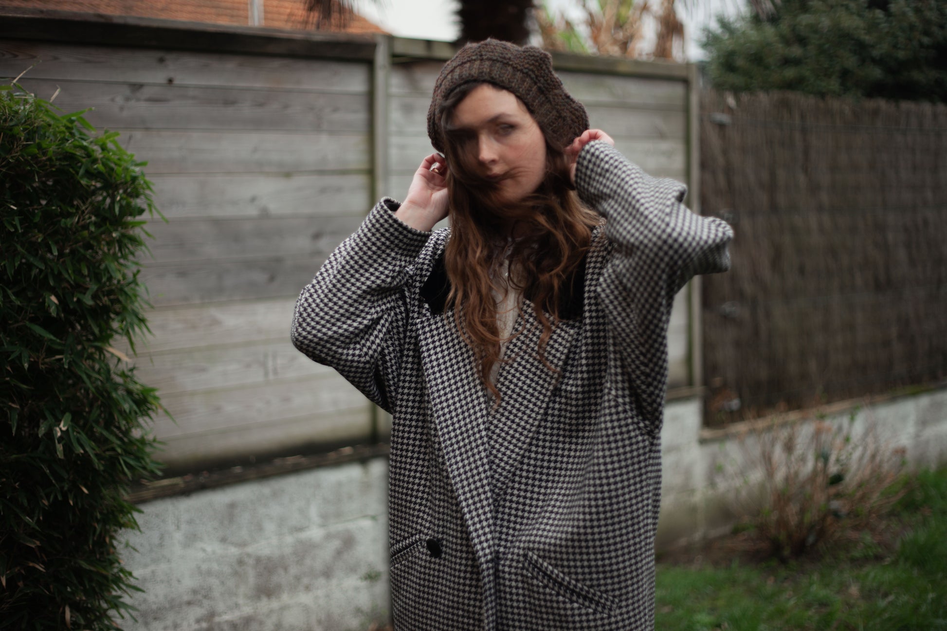 Veste "Electre" vintage. Fabriquée en France. 1980. Imprimé pieds de poule noir et blanc, col en velours lisse noir. Très bon état. Taille 38 (pour un porté très oversized) à 44.
